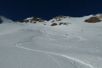 Viel Verfrachtung wie überall, aber Route bis zur Gipfelmulde in Aufstieg und Abfahrt ohne Steinkontakt möglich.