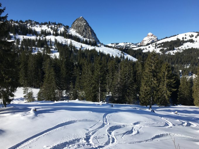 Die derzeit wenigen verfügbaren Parkplätze beim Wandli sind schon sehr früh am Morgen besetzt. Für Aufstieg zuerst auf dem Waldweg ab Oberiberg hat es aber ausreichend Schnee. Strecke ab Waldweg zum und vom Laucherenstöckli: stets guter Pulver. (An ganz wenigen, einzelnen Stellen vielleicht mal Gefahr für Steinkontakt).