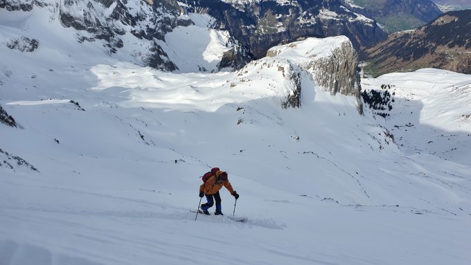 Im Aufstieg ist es in zwei Steilstufen einfacher zu Fuss zu gehen als mit Harscheisen (lockerer Pulver auf harter Unterlage) - sonst angenehm. Auf der Abfahrt hat es in den Mulden schöner Pulver, aber man muss immer wieder auf Steine aufpassen, und kann wegen dem wenigen Schnee nicht der Normalroute folgen (sondern den Spuren von heute folgen). Insgesamt Dank dem Pulver aber ganz klar die schönste Tour der Saison.