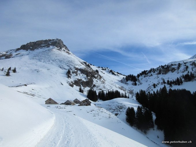 Dann auf der Alpstrasse (als Piste präpariert) nach Mittelstafel. Von dort gute Verhältnisse. In den Mulden hat es genug und schönen Pulverschnee. Die Kuppen sind oft abgeblasen. Ganz oben dann hart und eisig. Die letzten Meter zum Gipfel sind anstrengend.