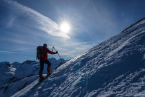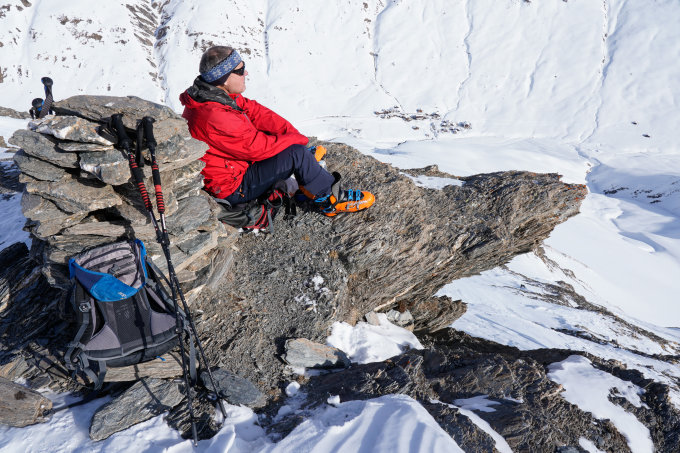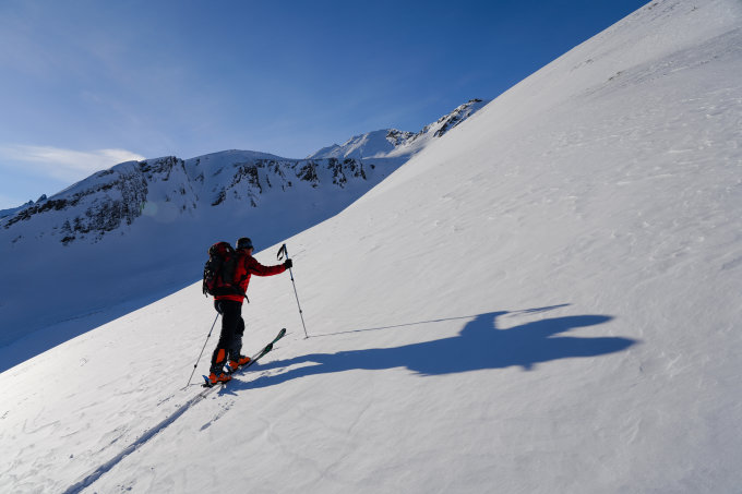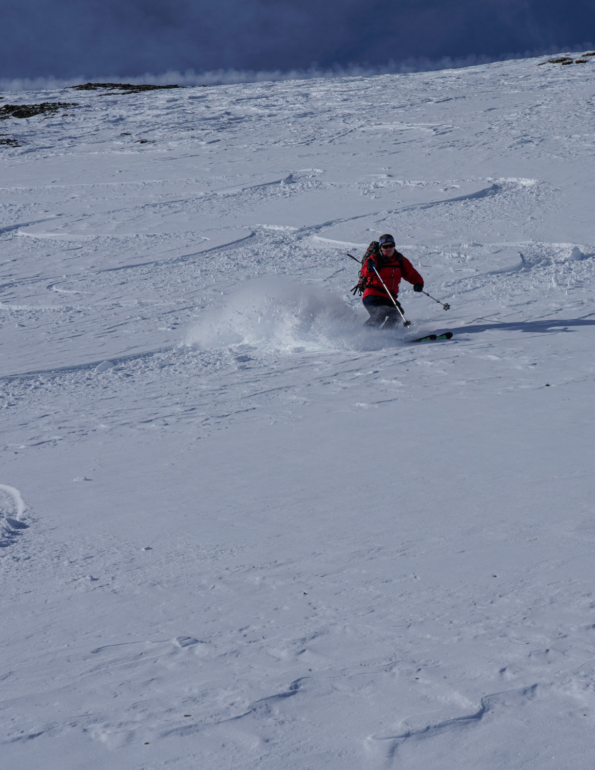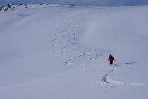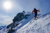 Der Rücken, über den man im oberen Abschnitt aufsteigt, sowie der Gipfelbereich sind verblasen und mit den Zastrugis etwas ruppig (Harscheisen!). Steinkontakt aber kein Problem.