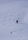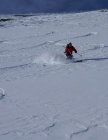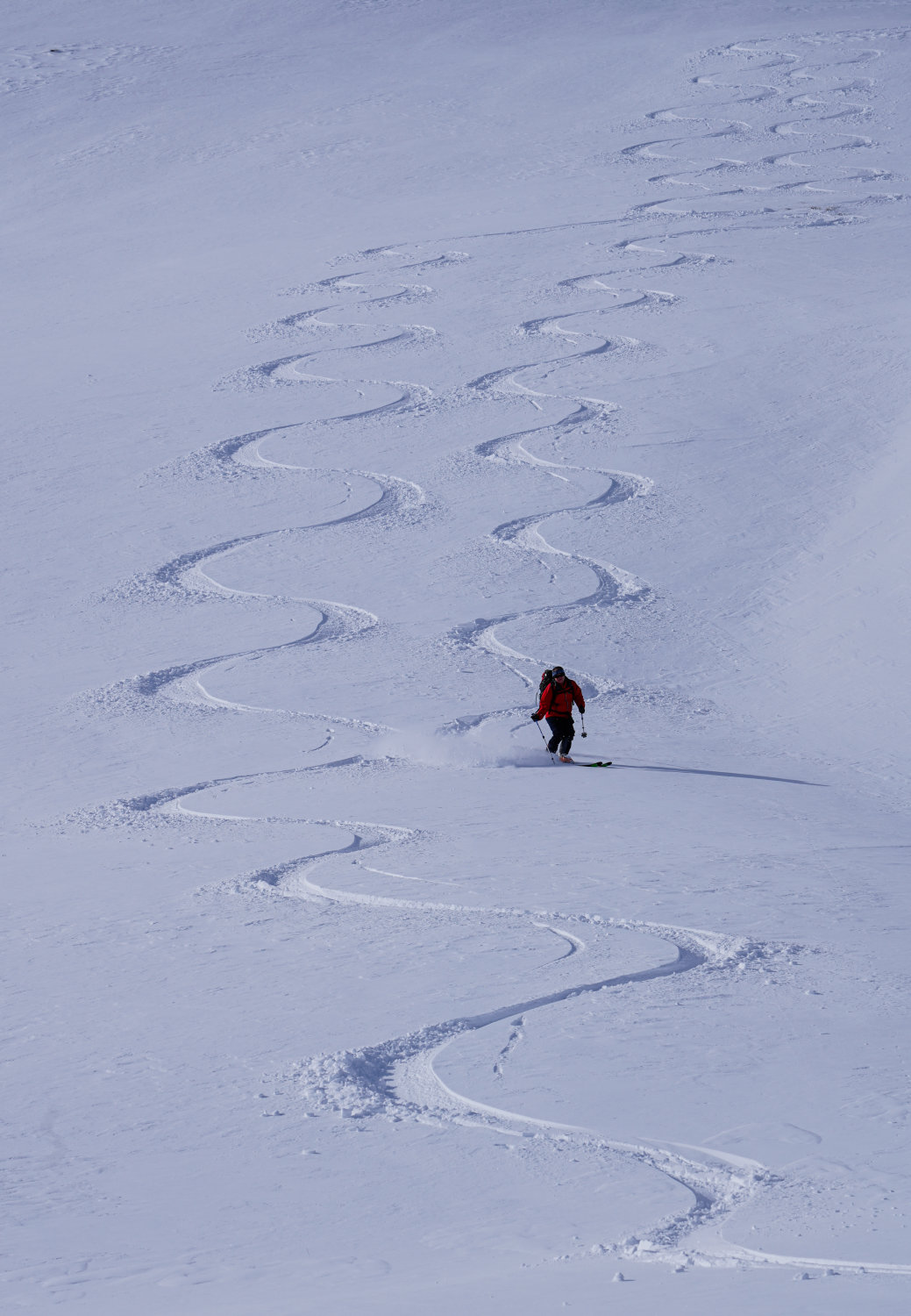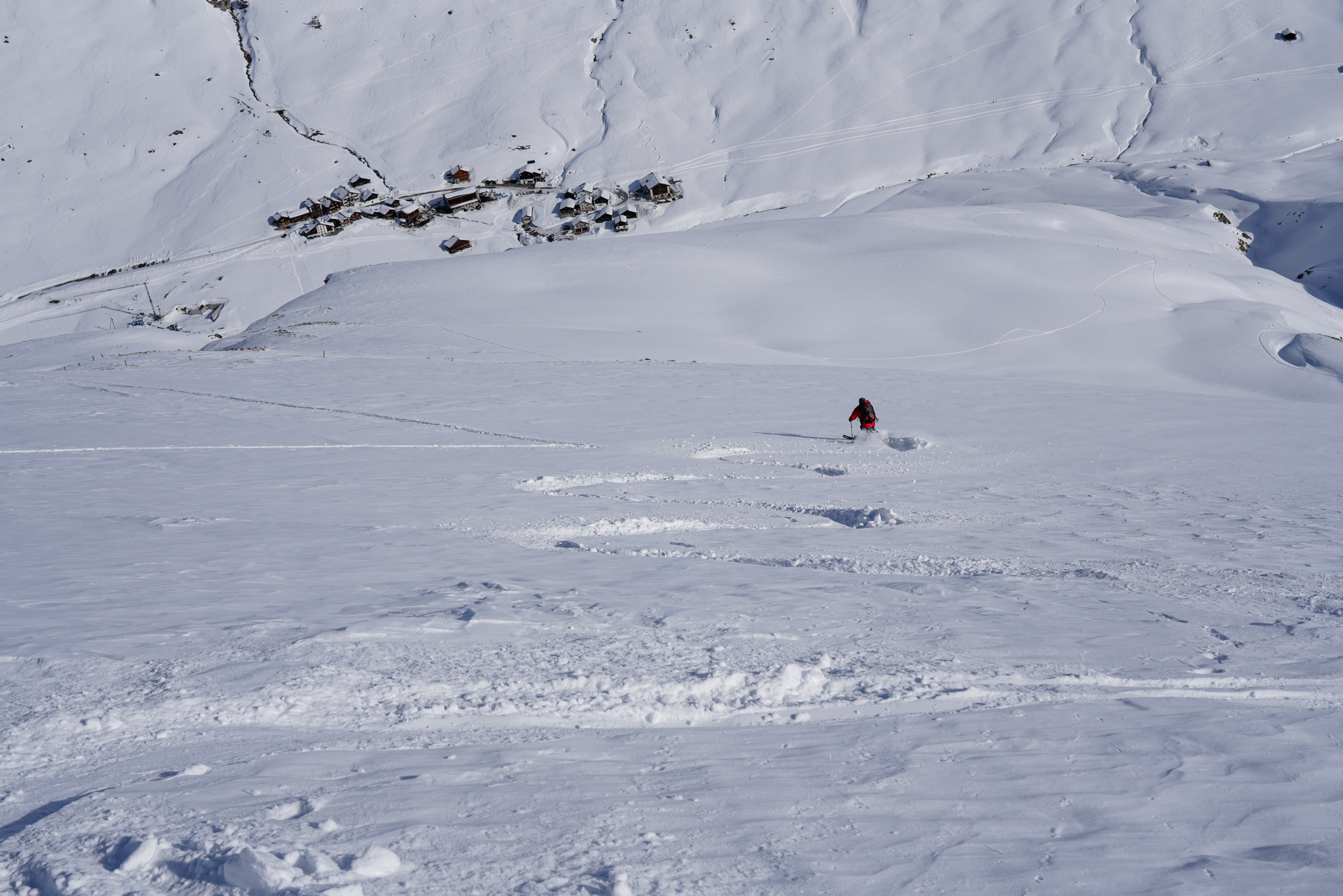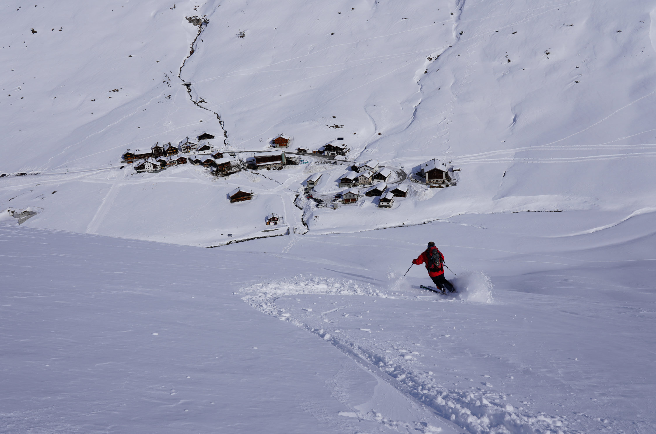Die Steilhänge sind aber noch PLENTY OF POWDER. Und - heute absolut UNVERSPURT. Wir waren alleine unterwegs - und es gab viel Platz für beschwingte Ornamente - bis hinunter vor die Tore Jufs ...