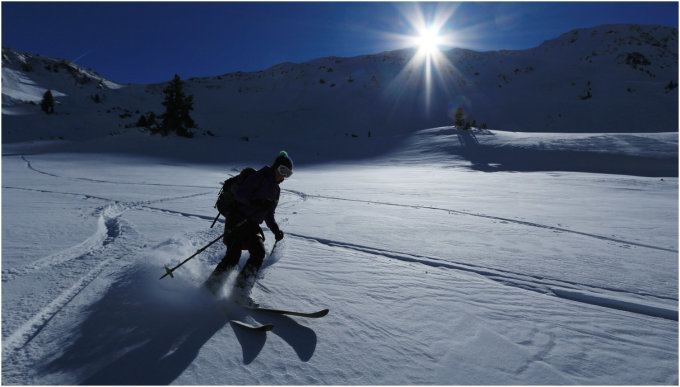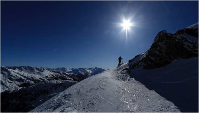 Wie nicht anders zu erwarten recht gemischte, insgesamt durch den Charakter der Tour ganz passable Verhältnisse. Im Einzelnen: Bis man den Wald verlässt Forstweg in gutem Zustand. danach in mehreren Serpentinen zum nächsten Waldgürtel. In diesem wenig Schnee. Danach in weitem Bogen nach linksausholend wieder zumindest ausreichend Schnee bis zum Grat. Dieser wiederum freigeblasen, allerdings knapp ausreichend hartschnee, teilweise glasig zum Gipfel. In der Abfahrt den weiten Bogen abkürzend dichter, nicht ganz einfach zu fahrender Pulverschnee. Den Rest über Waldschneisen und Forstweg ins Tal ebenfalls ganz gut zu fahren.