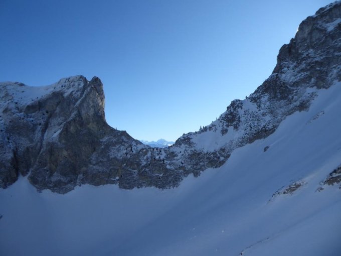 Abfahrt über Nordwestflanke: oberster Teil abgeblasen, man muss sich die brauchbaren Schneeflecke suchen. Nach ca. 100 m dann toll, vor allem im flacher werdenden Hang ein Pulvertraum, aber etwas aufpassen auf (gut sichtbare) Steine. Wiederaufstieg zum Sattel. Abfahrt ins Recardets-Tal top bis unten.