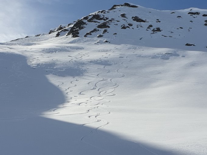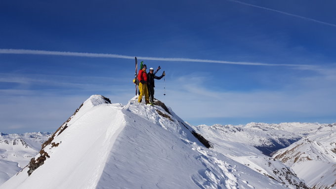 Sehr gute Verhältnisse bis kurz vor dem Gipfel, sehr hart und schlechter halt mit den Fellen. Daher die letzten Meter Ski aufgebunden und den Gipfel erreicht. Die Abfahrt war dann sehr gut bei richtiger Linienwahl Pulver bis zum Brüggli in Juf.