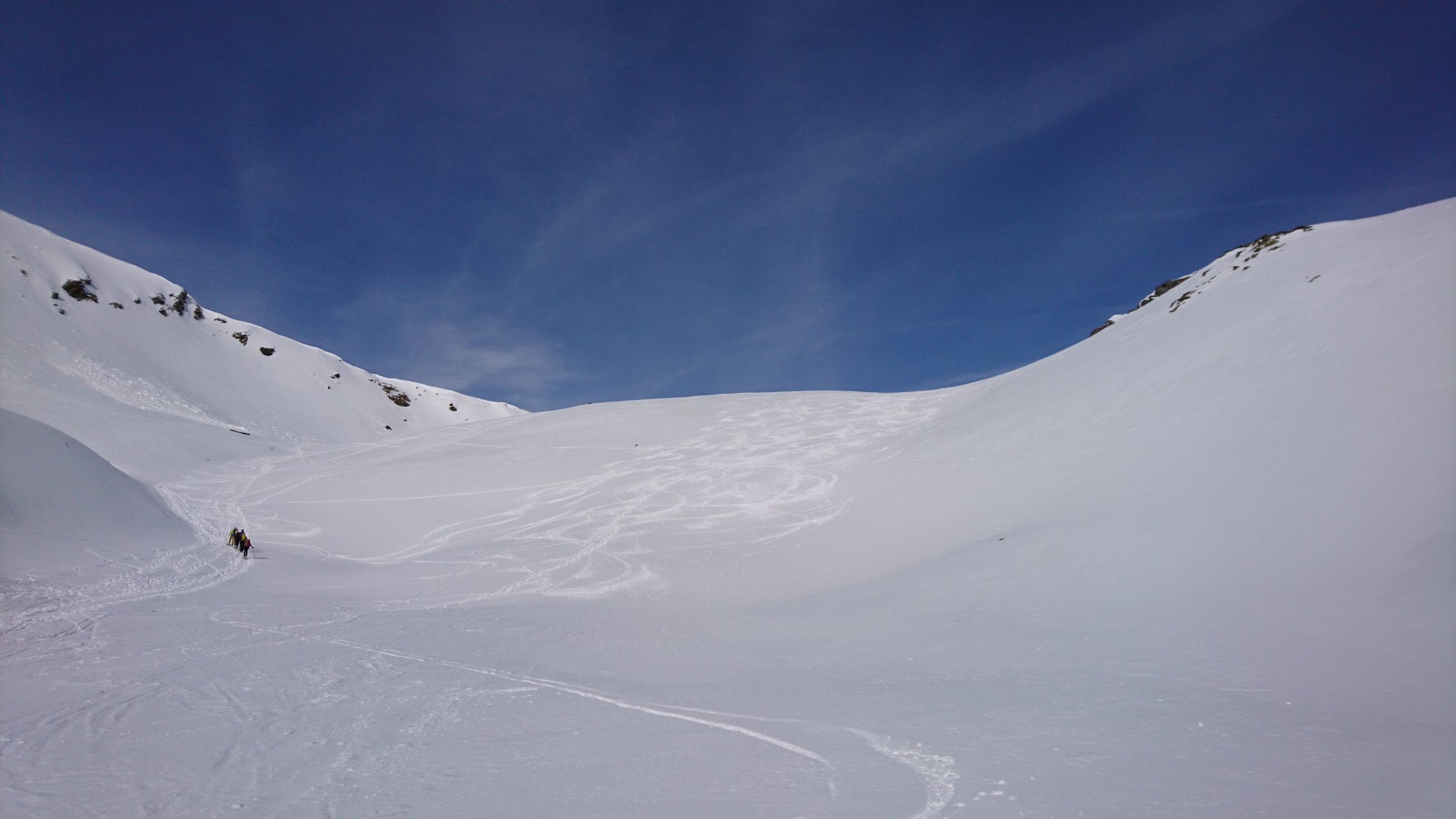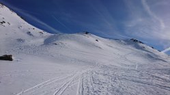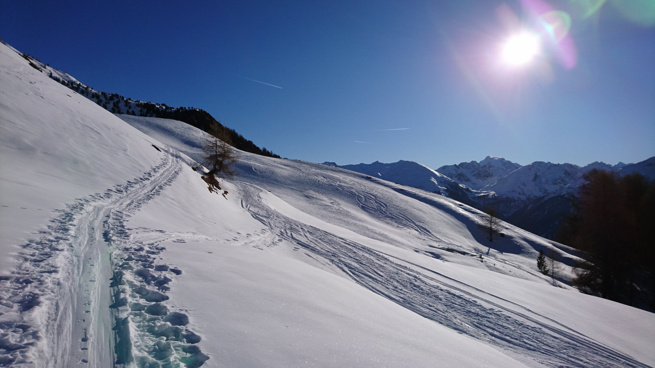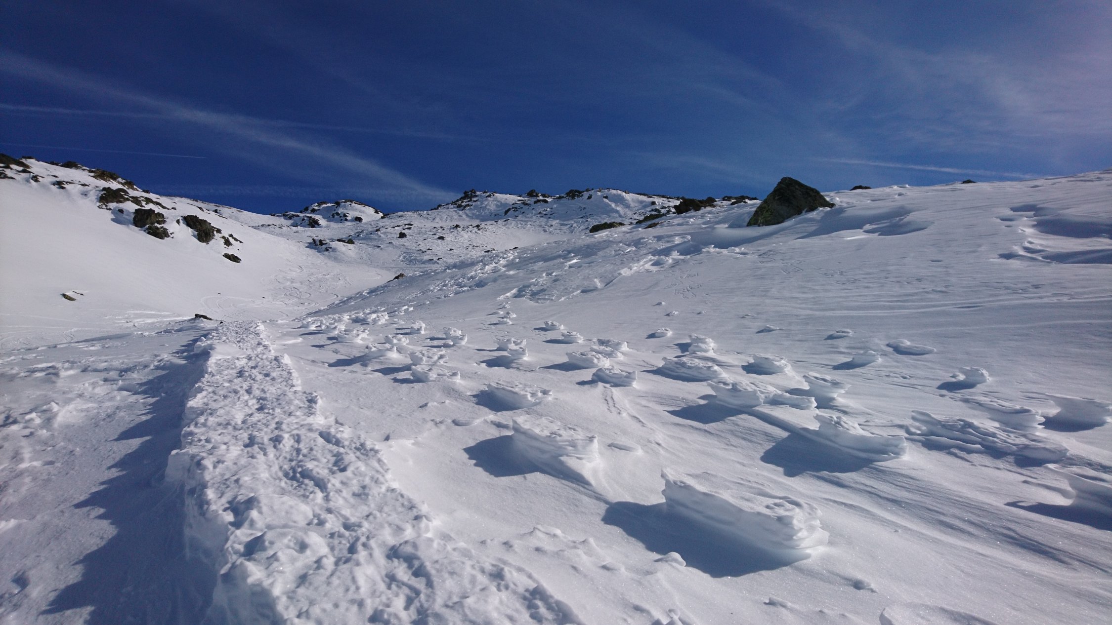 Aufstieg auf der Strasse bis Valmorain, da viele kahle Stellen. Die Strasse ist gut mit Schnee bedeckt, wenn auch die hartgefrorenen Spuren etwas mühsam sind. Ab Valmorain bis zur zur kleinen Hütte auf ca. 2400 hm gibt es keine eindeutige Aufstiegsspur, auf dem hartgefrorenen Schnee kommt man aber gut voran. Danach bessere Verhältnisse, stllenweise sogar noch harter Puder. Das etwas steilere Stück nach der Fuorcla Sassalba ist ohne Harscheisen mühsam, teilweise eisige Stellen. Danach wieder bessere Verhältnisse, die Gipfelabfahrt ist fast pistenähnlich.