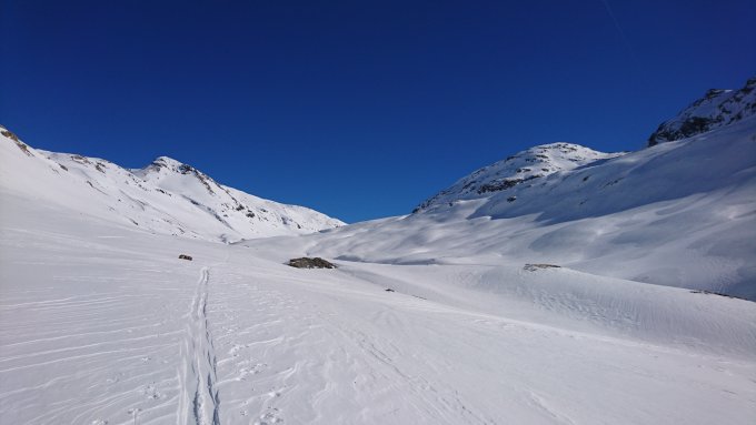 Der Aufstieg durchs Val da Fain begann vielversprechend, eine schöne Aufstiegsspur durch Pulver, nur ab und an abgeblasene eisige Stellen. In der Rinne zwischen Muot Arduond und Piz Minor herrschen eisige Verhältnisse, man braucht unbedingt Harscheisen. In der flachen Senke danach hartgefrorene Eisschollen und Eiskanten, die weder im Auf- noch Abstieg Freude bereiten. Der Gipfelaufstieg ist ebenfalls hartgeforen und teilweise eisig. Abfahrt über Aufstiegsroute, abgesehen von den Schollen im oberen Bereich ist es ok, es wechselt sich Bruchharsch mit eisigen Stellen ab, im Tal wieder Pulver.