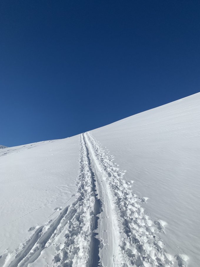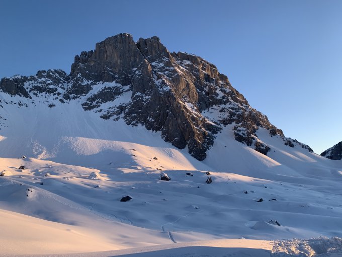 Es gab zum besten Wetter auch noch 25 cm frischen Pulver, der jedenfalls in den Schattenhängen fein zu fahren war, die Hänge am Girenspitz und Schafberg noch vielfach unverspurt. Wir waren nachts auf dem Schafberg, der Mond war hell genug, um ohne Stirnlampe zu gehen/abzufahren.
