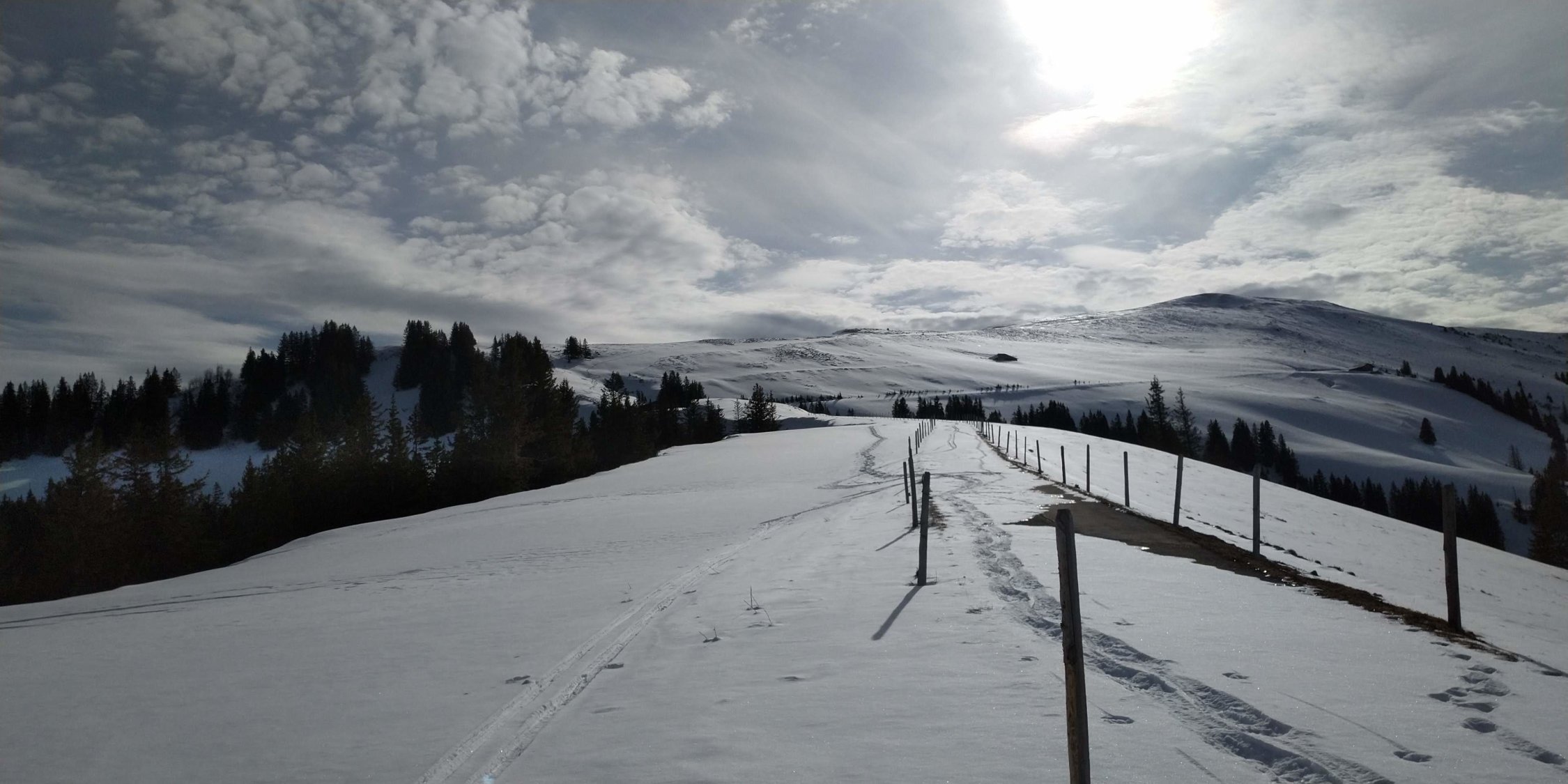 Ab Bahnhof Boltigen mit Ski der Strasse entlang. Einzelne Tragpassagen. Nach dem Goldbach noch einen Graben weitergelaufen und dann erst hochgestiegen Richtung Moosfang und dann wieder nördlich über Schitwägefang zur Hütte. Am Folgetag dann Aufstieg der Fahrstrasse entlang über Länggrüe, Burwald, da der Südhang des Schlossberg schon praktisch aper war. Die Fahrstrasse war aber durchgehend pulvrig. Da der Blutte Hubel abgeblasen und nur mit wenig Schnee bedeckt war, Abfahrt bei Punkt 1866m ins Buufal. Via Undere Buufal nach Rossberg. Die Hänge waren schon "rächt vercharet" aber doch noch einigermassen genüsslich fahrbar, wenn man sich nicht störte, durch den Pulver hindurch mehr oder weniger direkt auf dem Gras oder einer harten, dünnen Schneeschicht zu fahren.