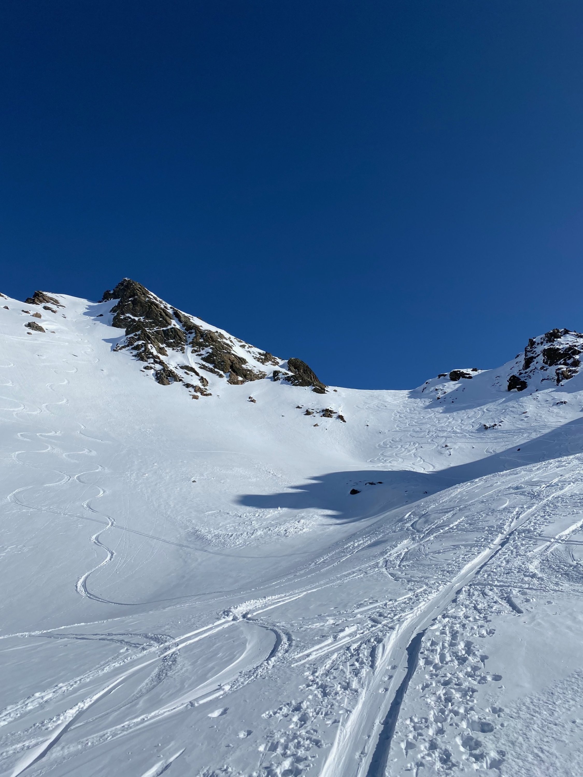 Untere Stufen ins Tschuggentäli mit wenig Schnee und Bruchharsch - sehr windverblasen. Ab ca. 2200 m dann WSW-seitig schöner Pulver, restliche Hänge sind von der Sonne aufgeweicht bzw. Bruchharsch. Verhältnisse am Gipfelhang sehr gut - auch bis Gipfel mit Ski zu besteigen.