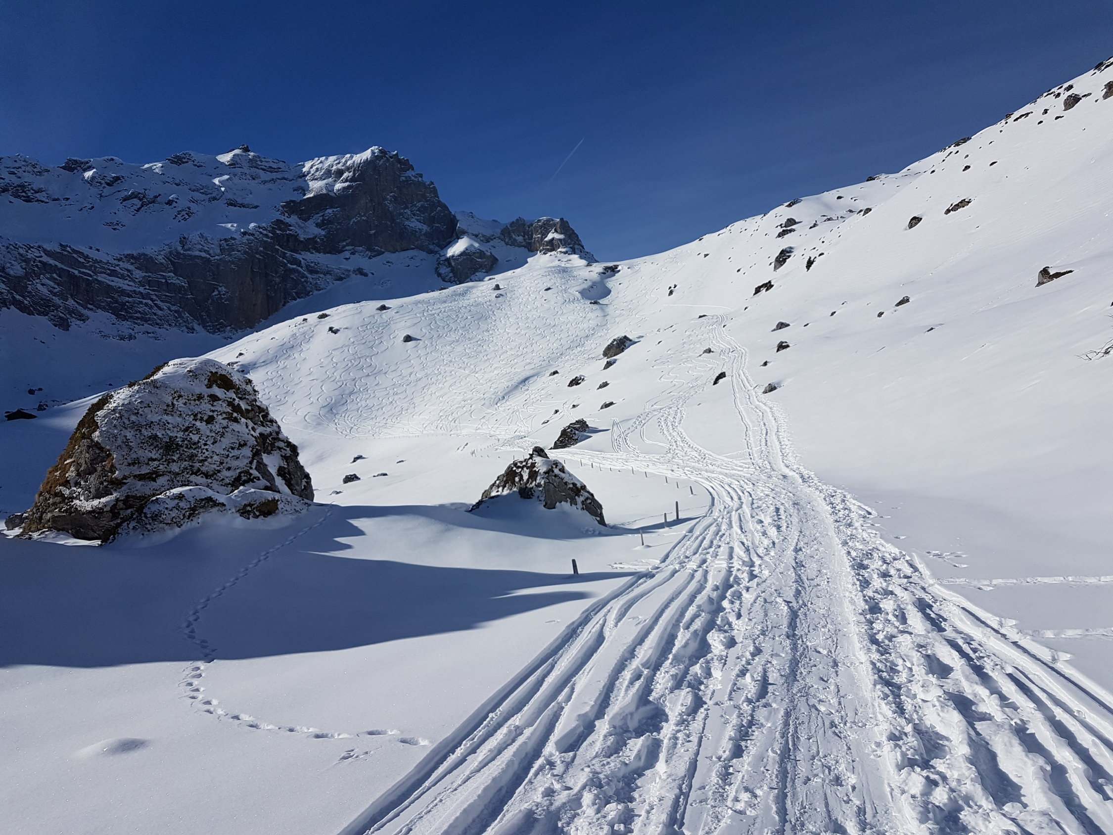 Das Kiental hat unglaublich wenig Schnee für Februar. Immerhin gibt es jetzt ab Parkplatz Tschingel bis auf den Gipfel grundsätzlich durchgehend Schnee. Richtig Skifahren kann man auf den Strassen und ab Dünde-Mittelberg dann auch im Gelände. Das ist grundsätzlich positiv und reicht für tolle Skitourenerlebnisse völlig aus.
