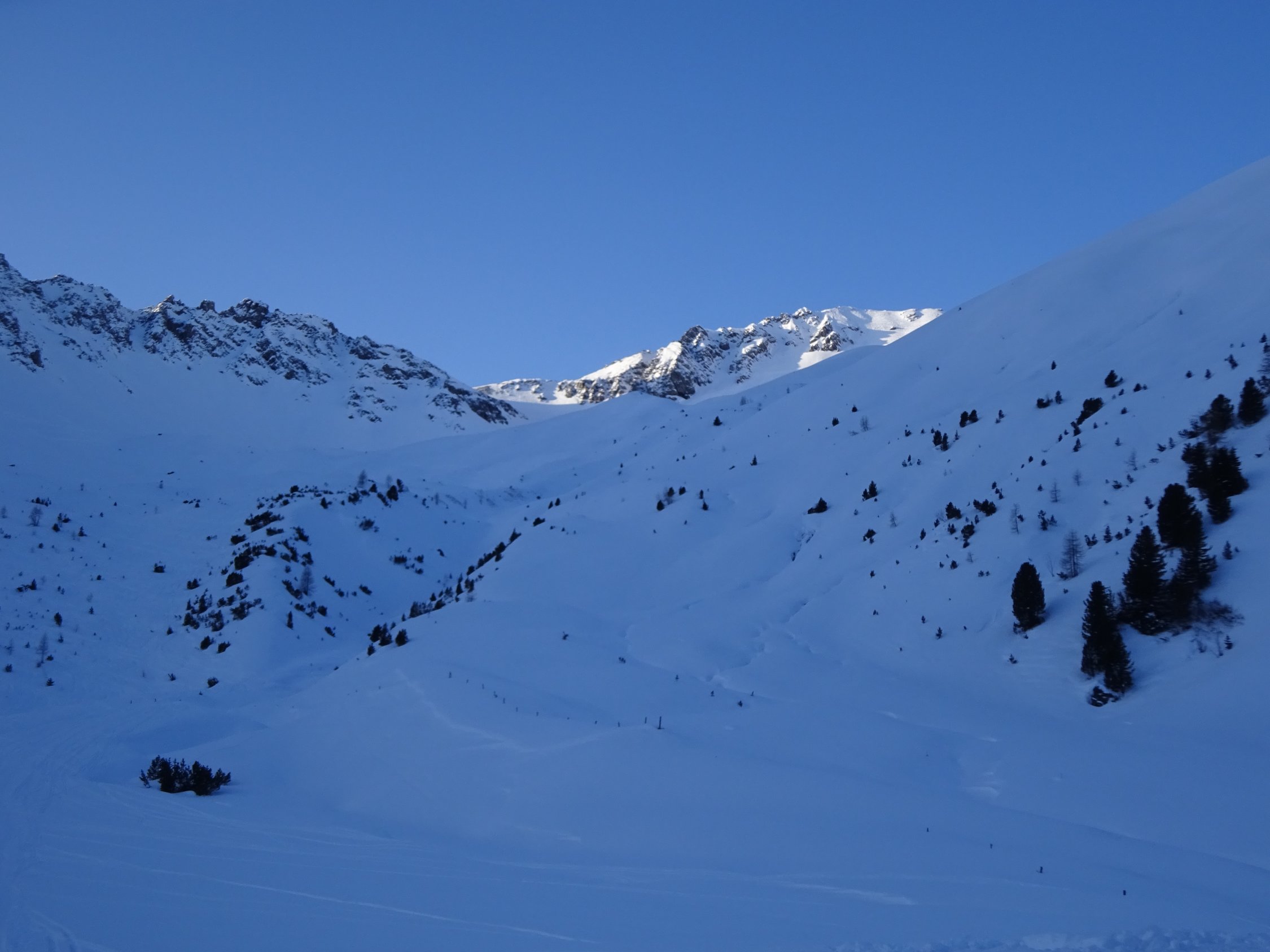 Das Monsteiner Büelenhorn ist ein ausnehmend schöner Skiberg! In den schattigen weiten Mulden zwischen der Inneralp und dem Gipfelhang hält sich der Pulver lange, und Platz für eine eigene Linie findet man auch nach ein paar Tagen Schönwetter immer. Auch heute toller Pulver, kaum verblasen oder gedeckelt! Nur der Gipfelhang ist gründlich verfahren, aber trotzdem gut zu fahren. Gute Spur bis auf den Gipfel. Abfahrt direkt vom Gipfel. Dann bietet sich die Alp Mäschenboden für eine sonnige Pause an, und in Monstein gibt es feine Kuchen und ein vorzügliches Bier;-)