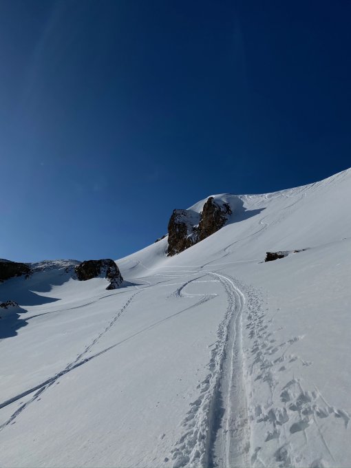 Die Verhältnisse sind im Aufstieg alles andere als Top. Die Abfahrt jedoch, wird mir reichlich Pulverschnee belohnt. Auf den gräten ist der meiste Schnee verblasen.