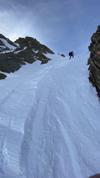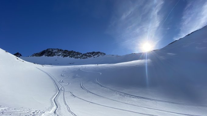 Traumhafte Verhältnisse durch die Steilrinne und den Kuhscheibenferner. Pulver ohne Ende ! Der Abstieg zur Scharte ist teilweise sehr heikel da wenig Schnee liegt und der Fels zum Teil sehr brüchig ist !