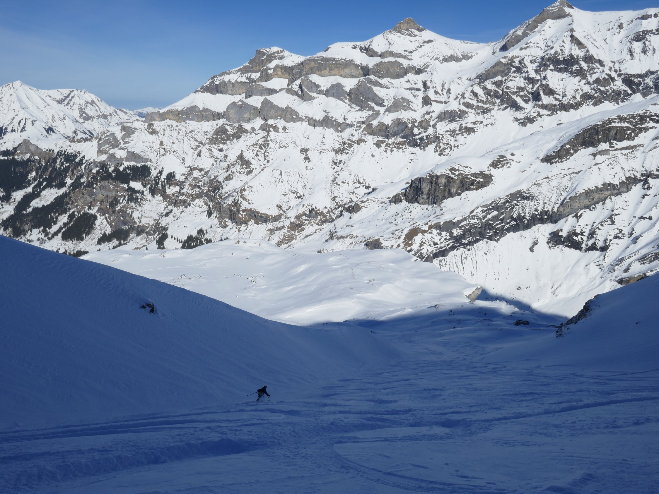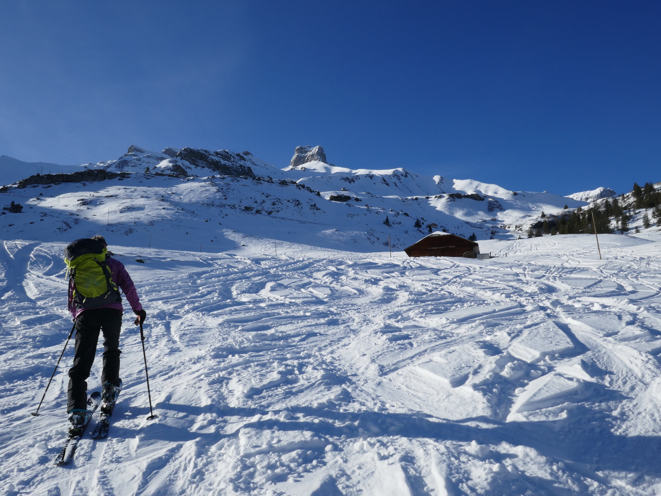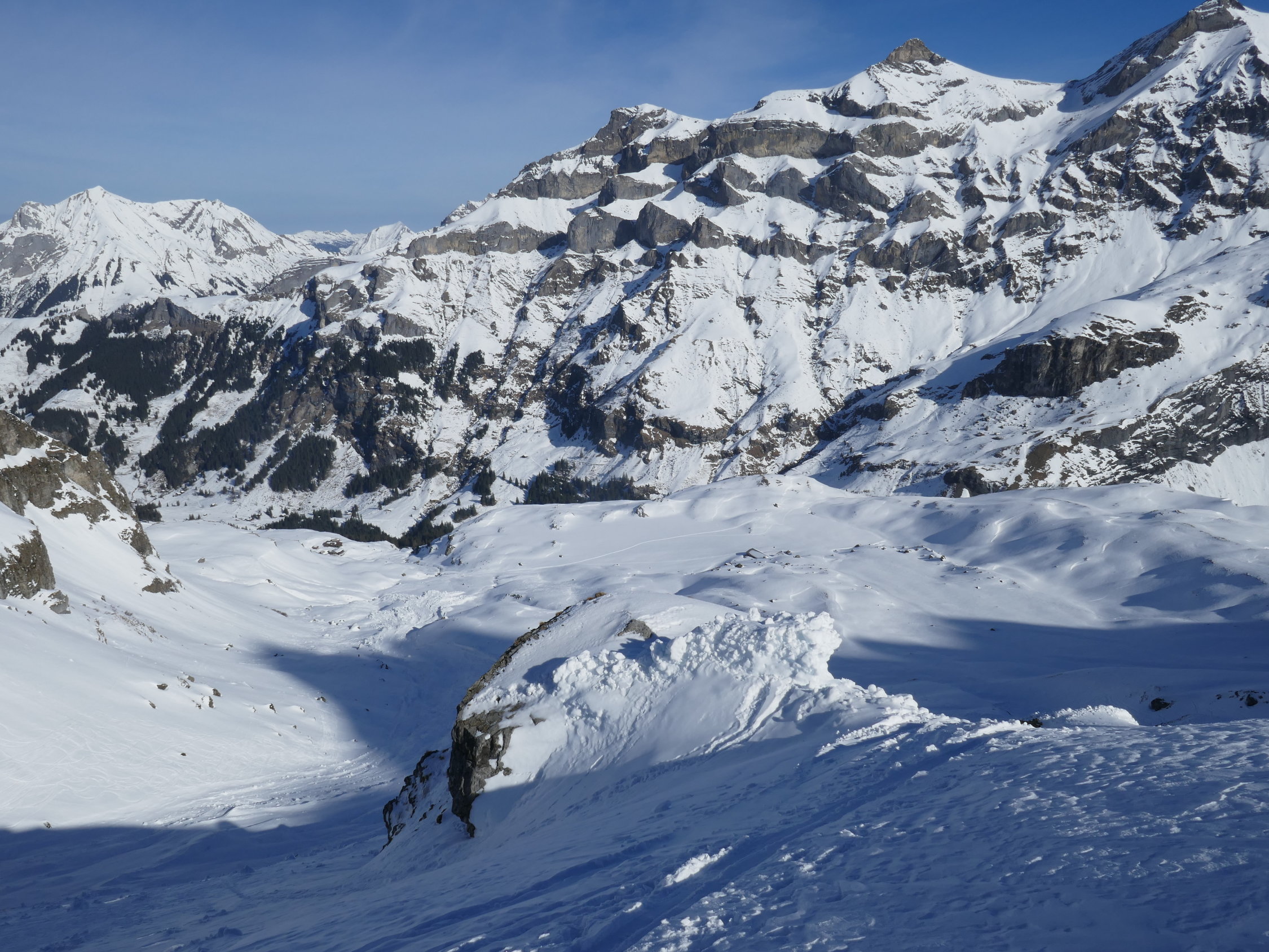 Vom Wind kaum bearbeiteter Pulverschnee und genügend verschneite Alpwege und -