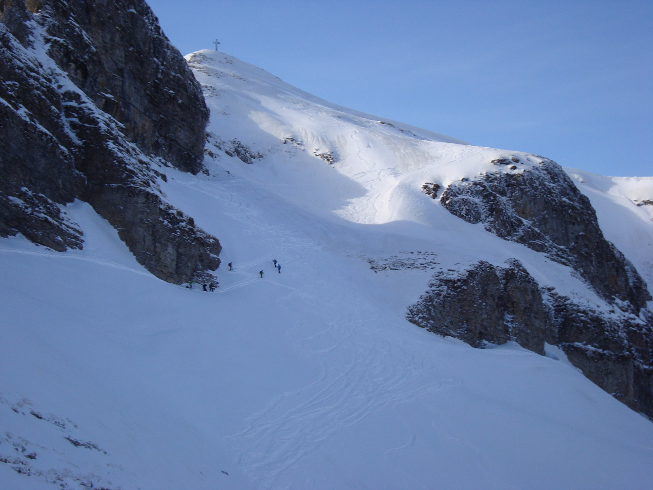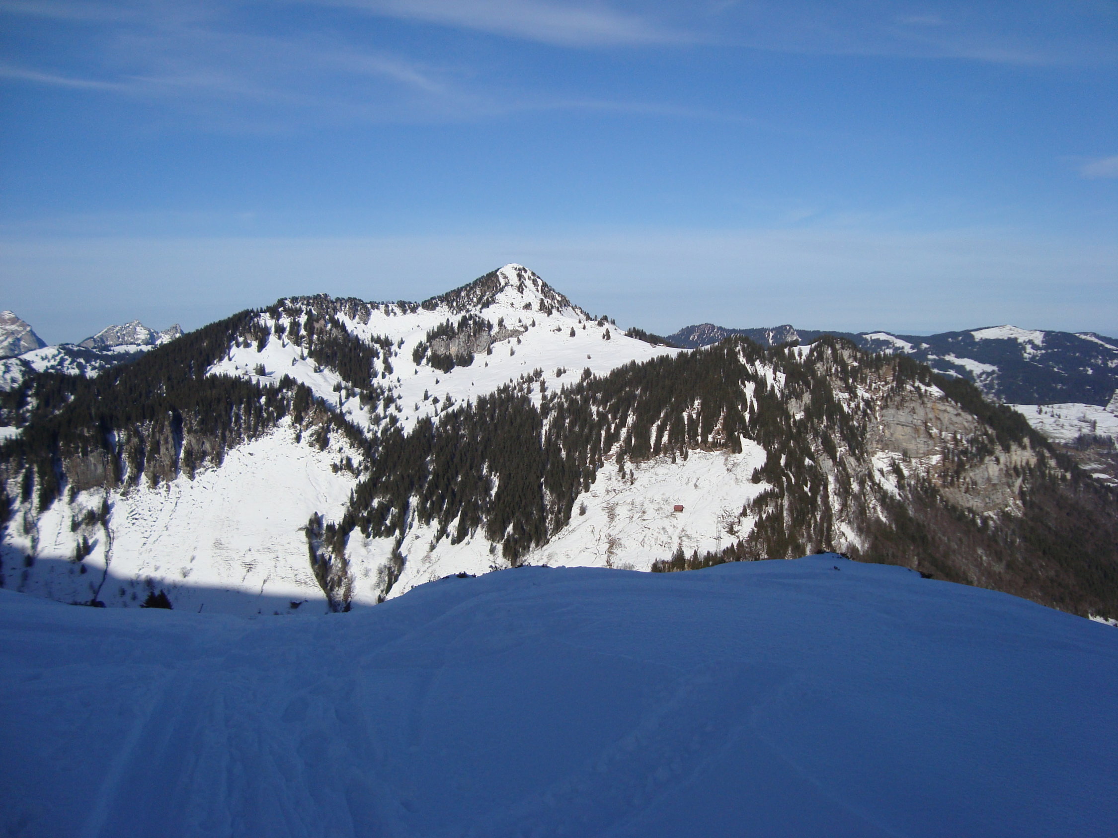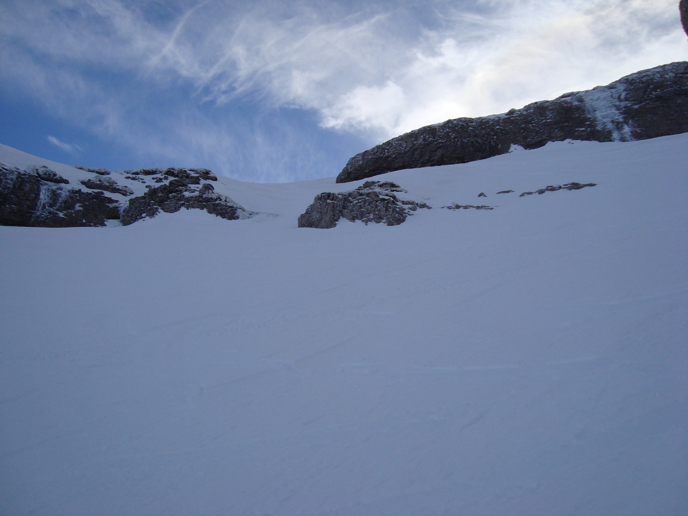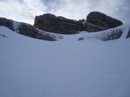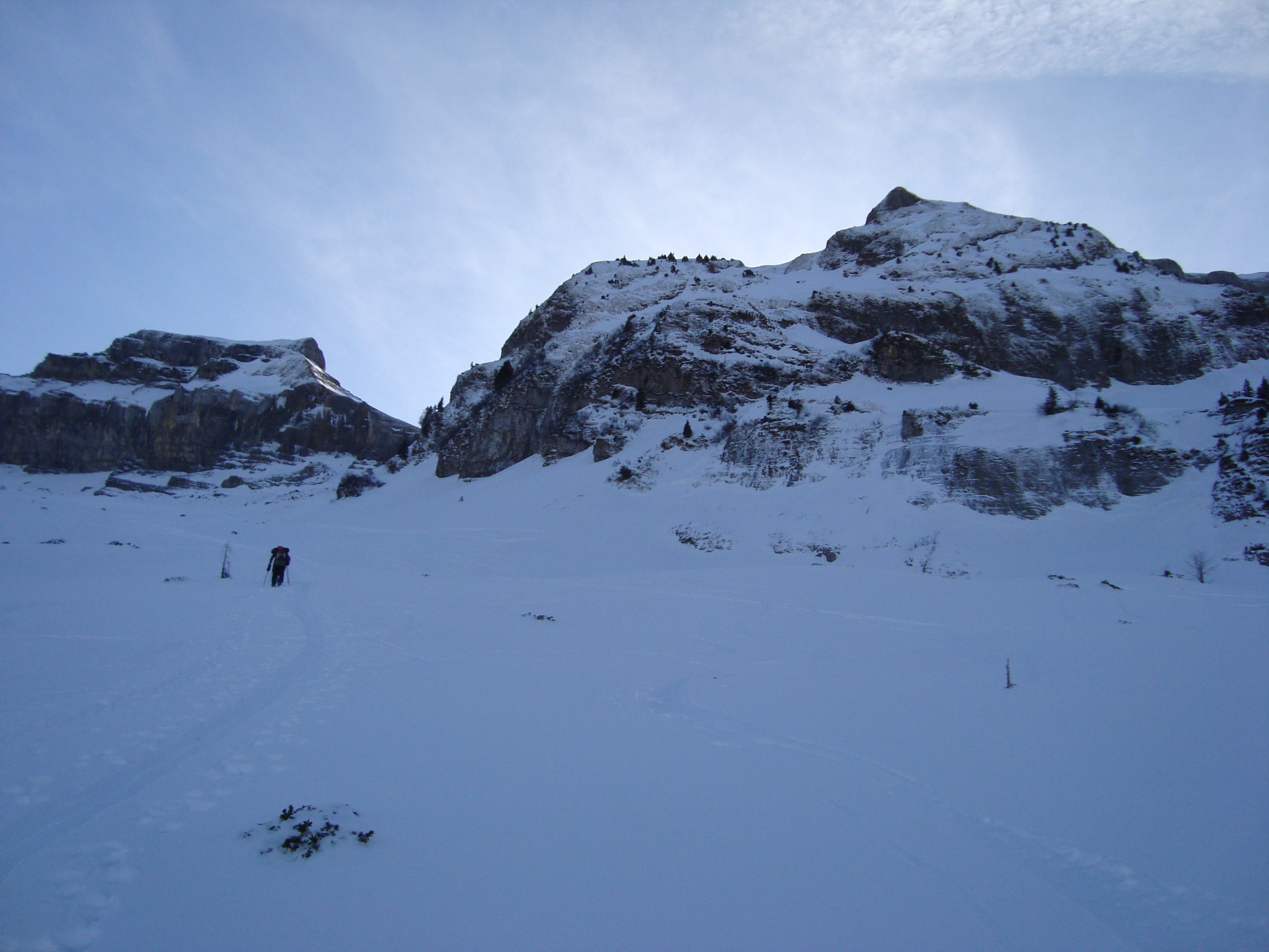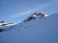 Ab dem Waldgürtel bessert sich die Schneesituation merklich. Ca. 20cm Pulver auf einer harten Unterlage. Es liegt eine gute Aufstiegsspur bis zum ersten Felsriegel. Hier montierte ich die Harscheisen. Nach diesem wird es dann zunehmend eisiger unter den Skiern. Zudem erschien mir der sehr steile Gipfelhang zum grössten Teil abgeblasen und sehr eisig, der Pulverschnee darauf ungebunden, locker. Daher Abruch, wie die meisten der anderen Tourler. Ca.5Tourler gingen heute zum Gipfel.