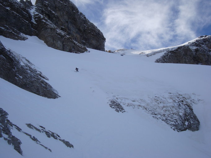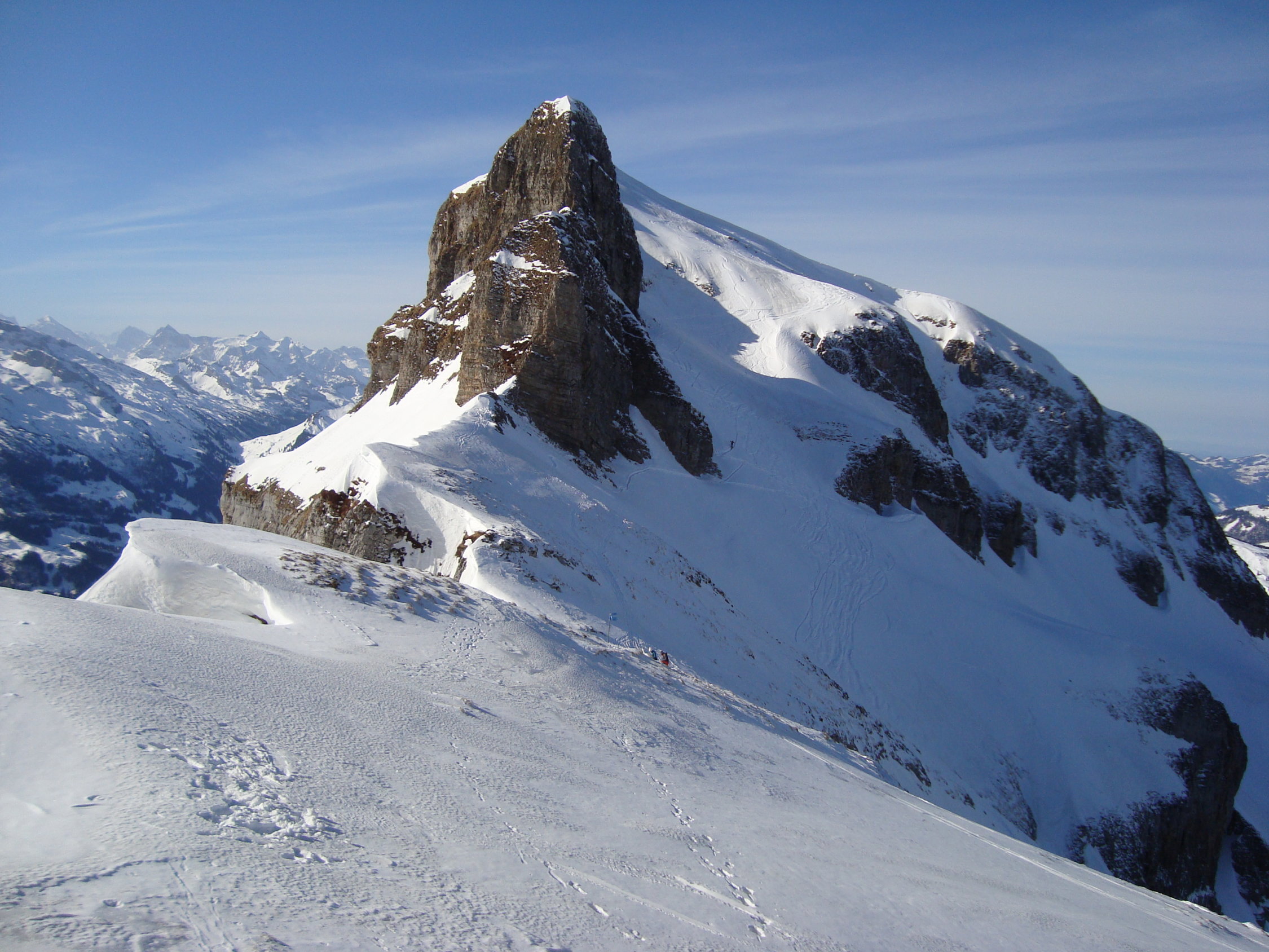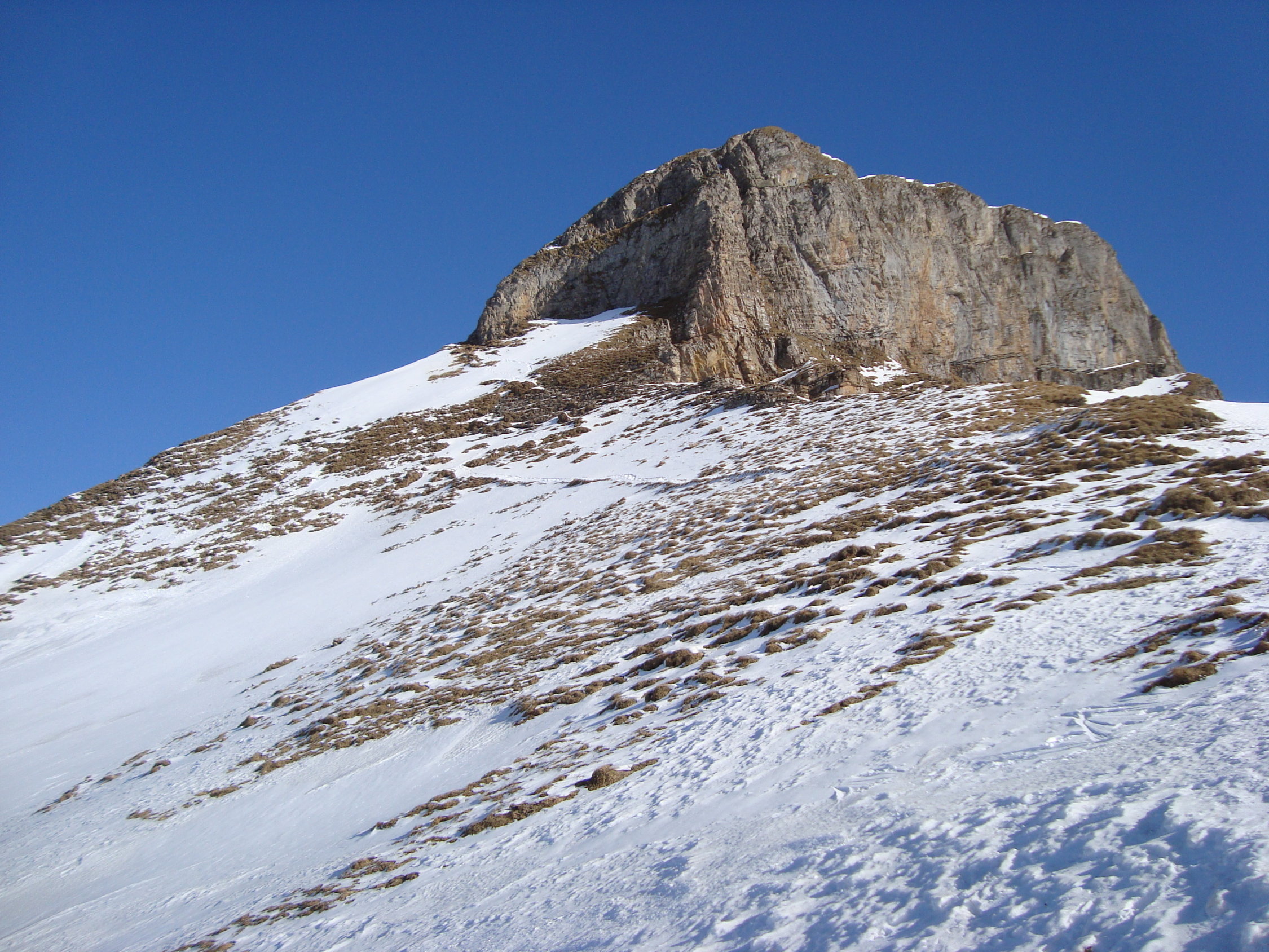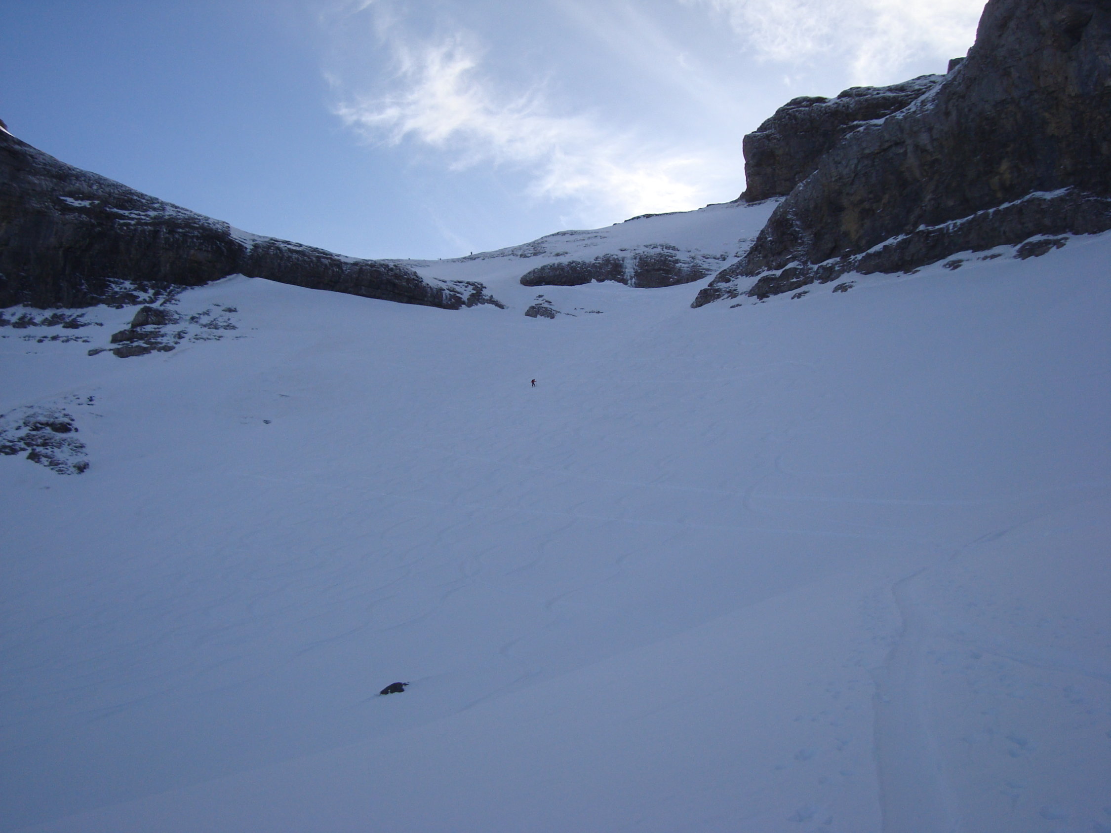 Ab dem Waldgürtel bessert sich die Schneesituation merklich. Ca. 20cm Pulver auf einer harten Unterlage. Es liegt eine gute Aufstiegsspur bis zum ersten Felsriegel. Hier montierte ich die Harscheisen. Nach diesem wird es dann zunehmend eisiger unter den Skiern. Zudem erschien mir der sehr steile Gipfelhang zum grössten Teil abgeblasen und sehr eisig, der Pulverschnee darauf ungebunden, locker. Daher Abruch, wie die meisten der anderen Tourler. Ca.5Tourler gingen heute zum Gipfel.