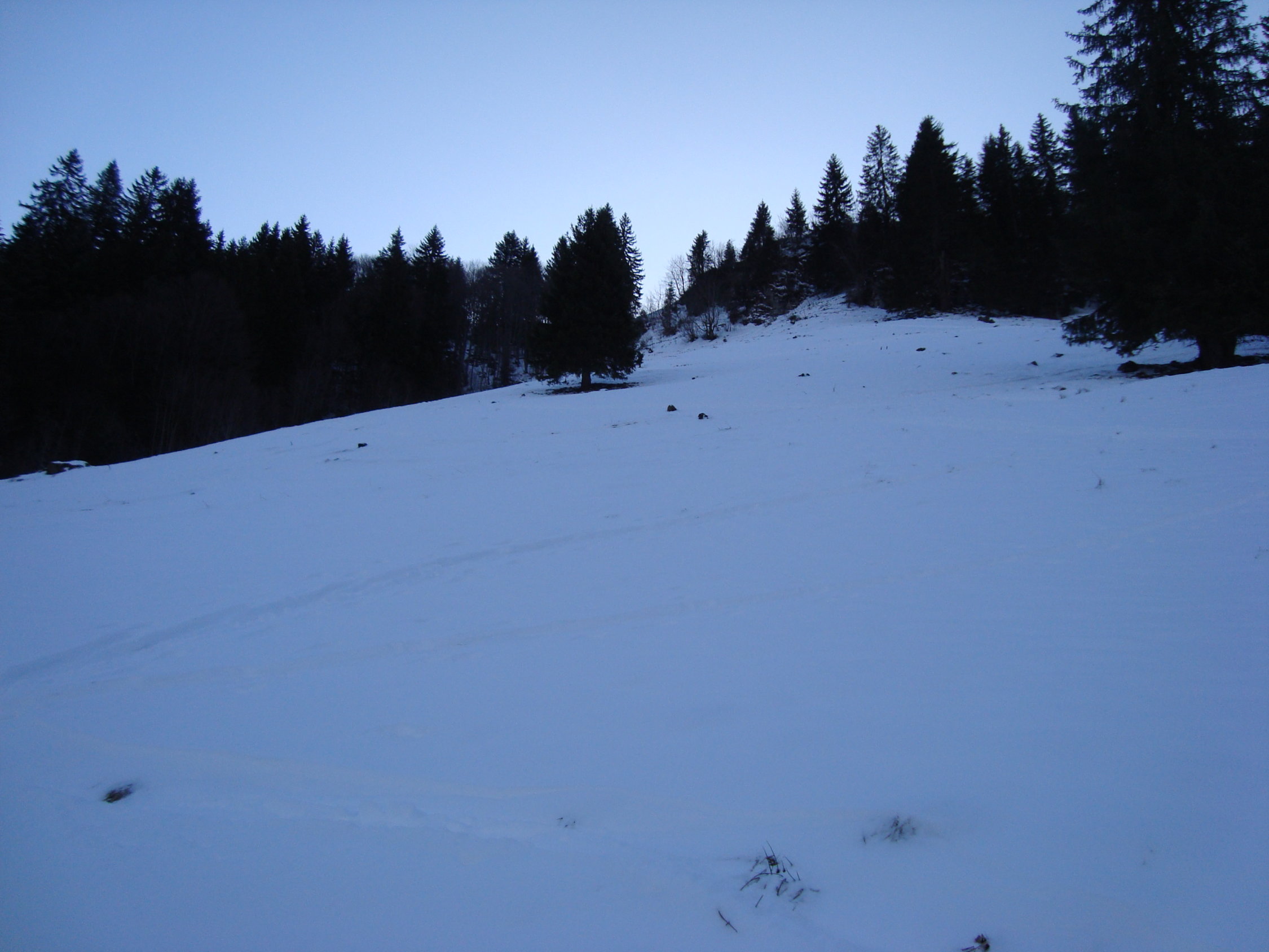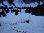 Der erste steilere Hang zur Forststrasse ist im Aufstieg gut zu bewältigen. Zum Abfahren taugt dieser momentan , wegen der noch mageren Schnneedecke nix. Auch der Steilhang oberhalb der Forststrasse bis zum Waldgürtel ist eher fürs Aufsteigen interessant.