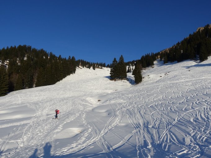 Wenn man frühmorgens am Parkplatz steht und die deutlich sichtbaren Grasbüschel die Hänge hoch zum Siplingerkopf sieht, glaubt man ja nicht, dass das ein ziemlich guter Skitourentag werden könnte. Über die ersten Meter bis zur Alpe Oberbalderschwang hilft ein gewalzter Schlittelweg. Und ab dort langt's dann, ohne dass man hoch wie runter Sharks trifft. Das Highlight versteckt sich jedoch auf der Nordseite vom Siplingerkopf, genauer gesagt, die NO-Abfahrt vom Heidenkopf: Top Pow bester Qualität. Kaum zu glauben. Mussten da gleich nochmal hoch und wieder runter. War sensationell! Die Abfahrt zurück in Richtung Balderschwang runter vom Heidenkopf ist teilweise pistenartig ausgefahren. Nicht der Hit, aber ganz brauchbar zu fahren. Und ab Alpe, wie gesagt, bringt einen der gewalzte Schlittelweg komfortabel ins Tal. Insgesamt deutlich besser als erwartet.