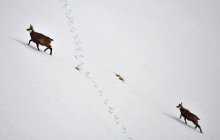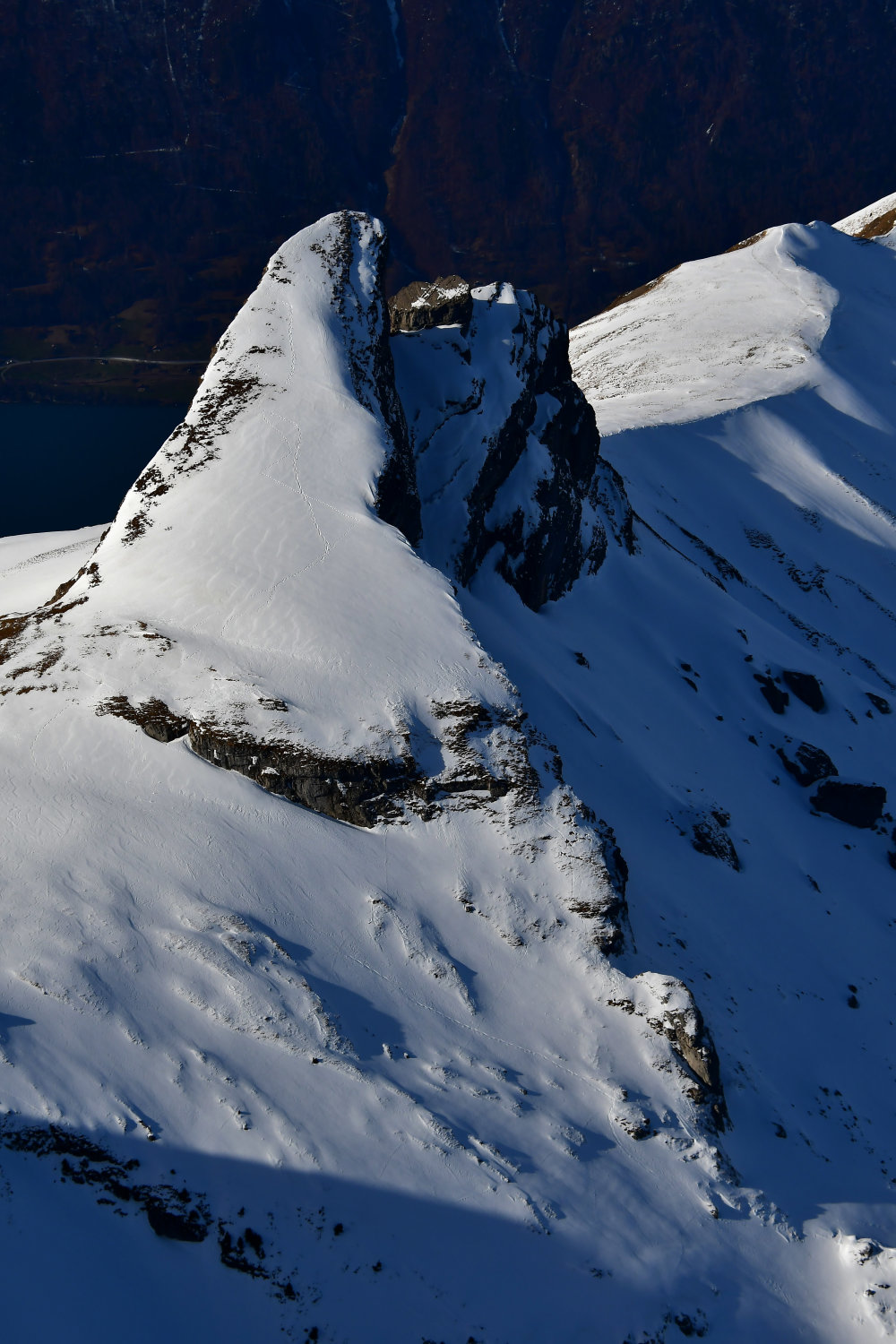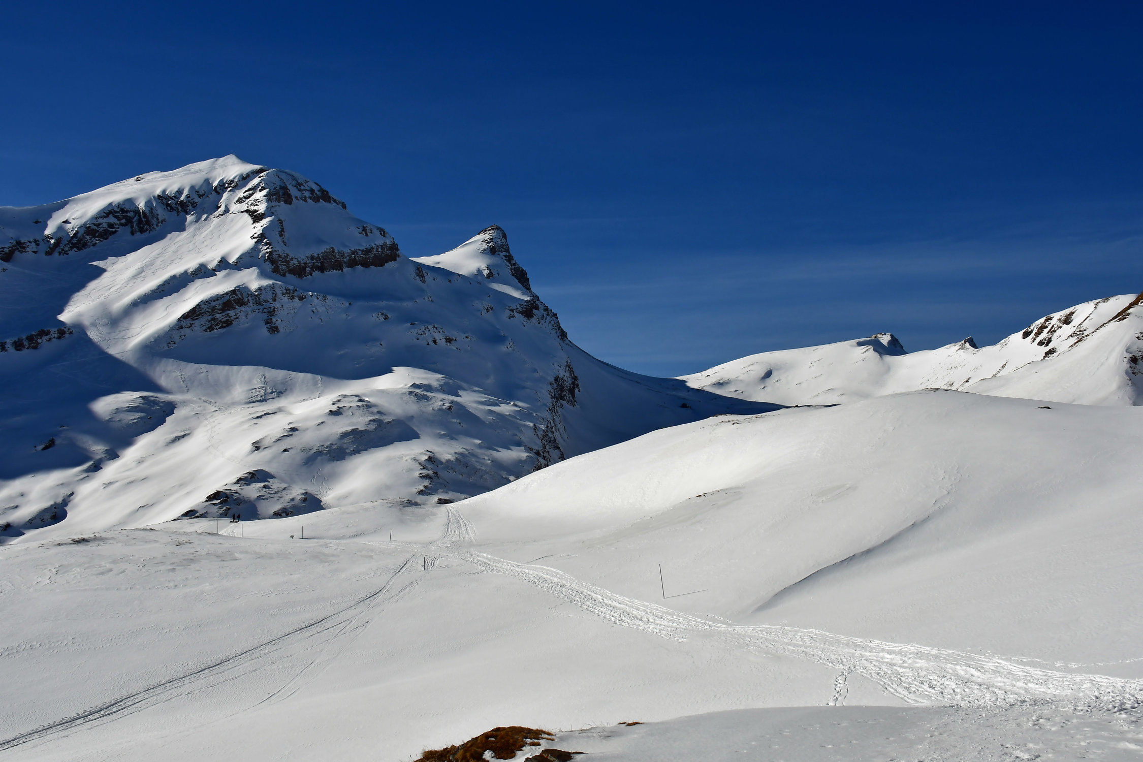 Leider etwas knapp an die Zeit und da ist dieser kleiner Tour immer wieder lohnend. Das Gipfelpanorama unschlagbar und objektiv bombensicher. Als alle Schlittler inzwischen in Richtung Bussalp verschwunden waren und nur noch wenige Schneeschuhläufer sich Richtung First bewegten, zeigten sich die Gemsen wieder. Ja, das ist doch ihre Domäne!