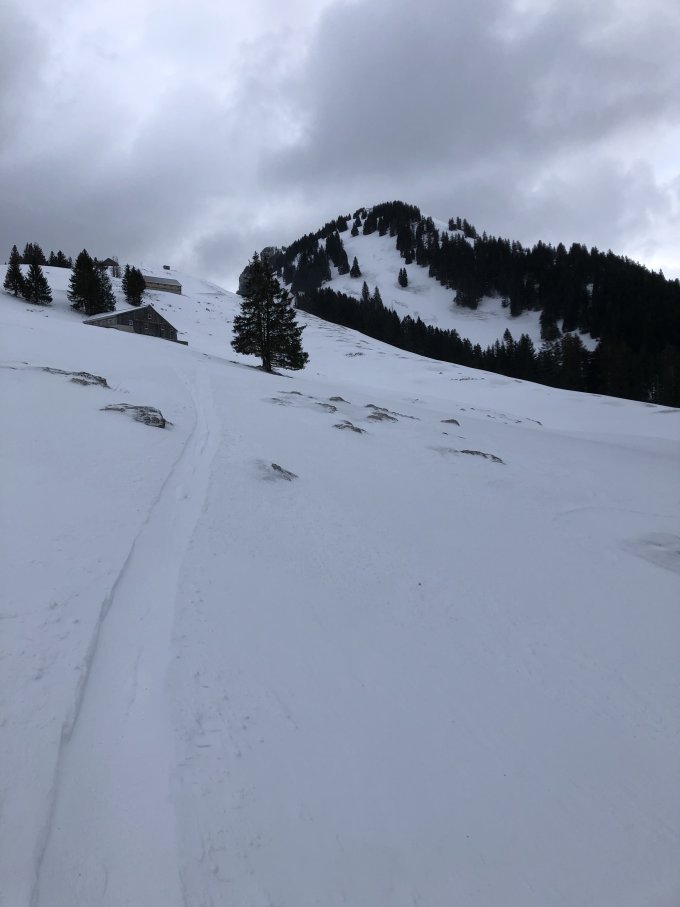 Genug Schnee bis Amden Dorf. Wie erwartet stark windbearbeitet. Mächtige Verwehungen wechseln sich ab mit blank geblasener Eiskruste, Ablagerungen in den Südosthängen. Für den Steilhang ab Hüttlisboden sind Harsteisen hilfreich.