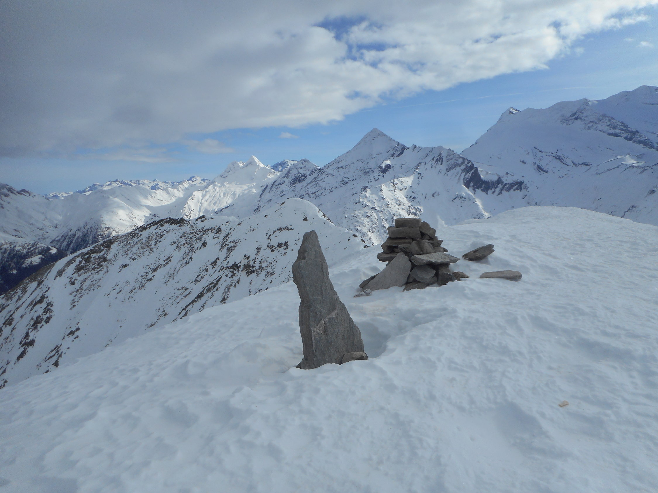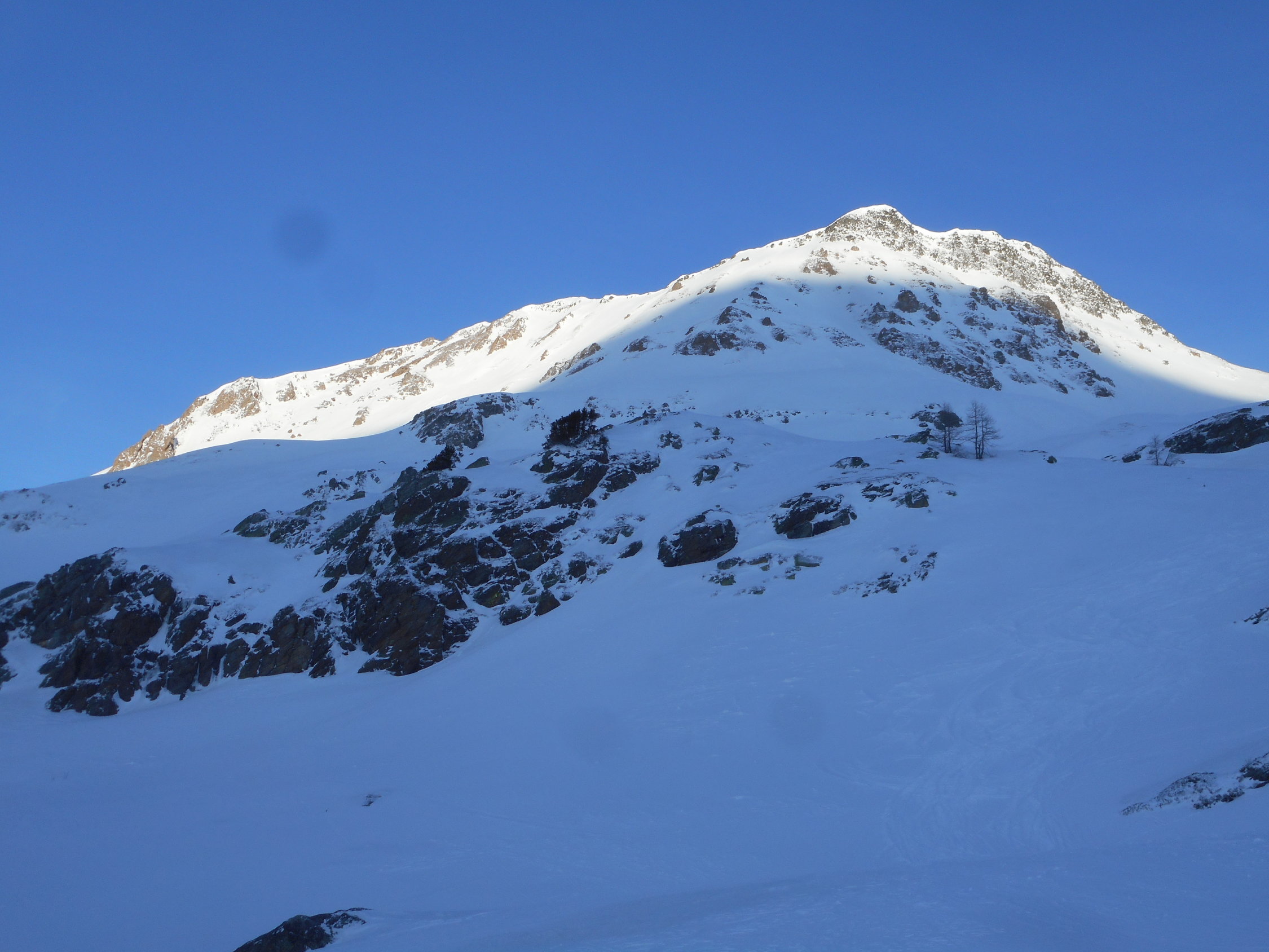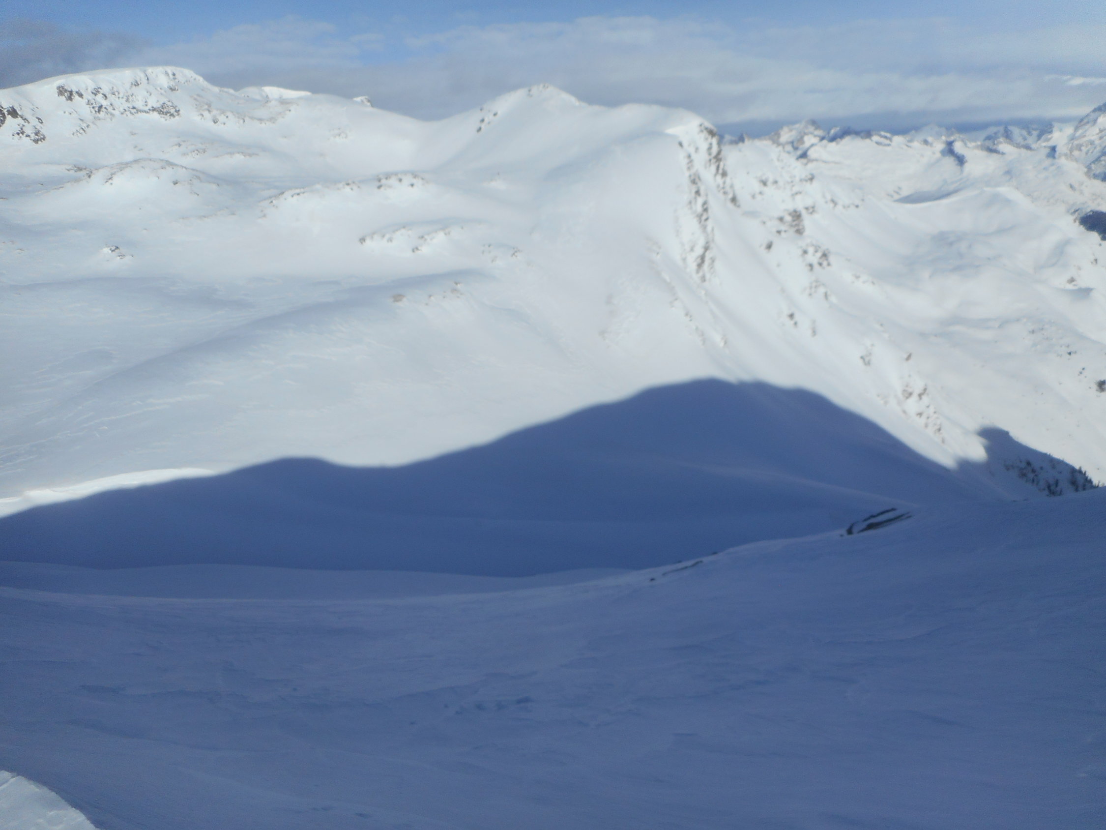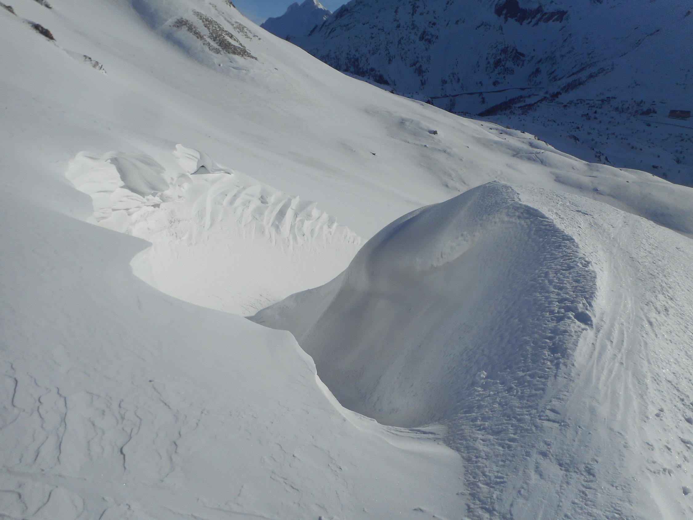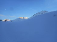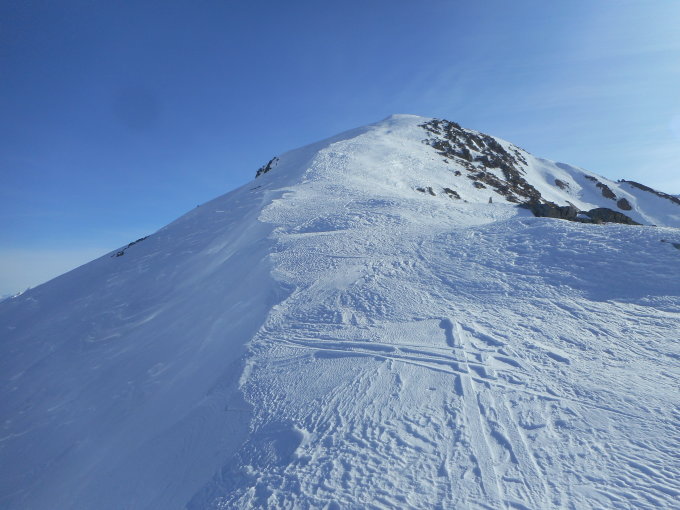 In den Mulden hatte es 10cm bis 20cm hingewehter Pulverschnee auf einer tragenden Unterlage. An den exponierten Stellen wie auf Graten und Südhängen harter und griffiger Firnschnee.