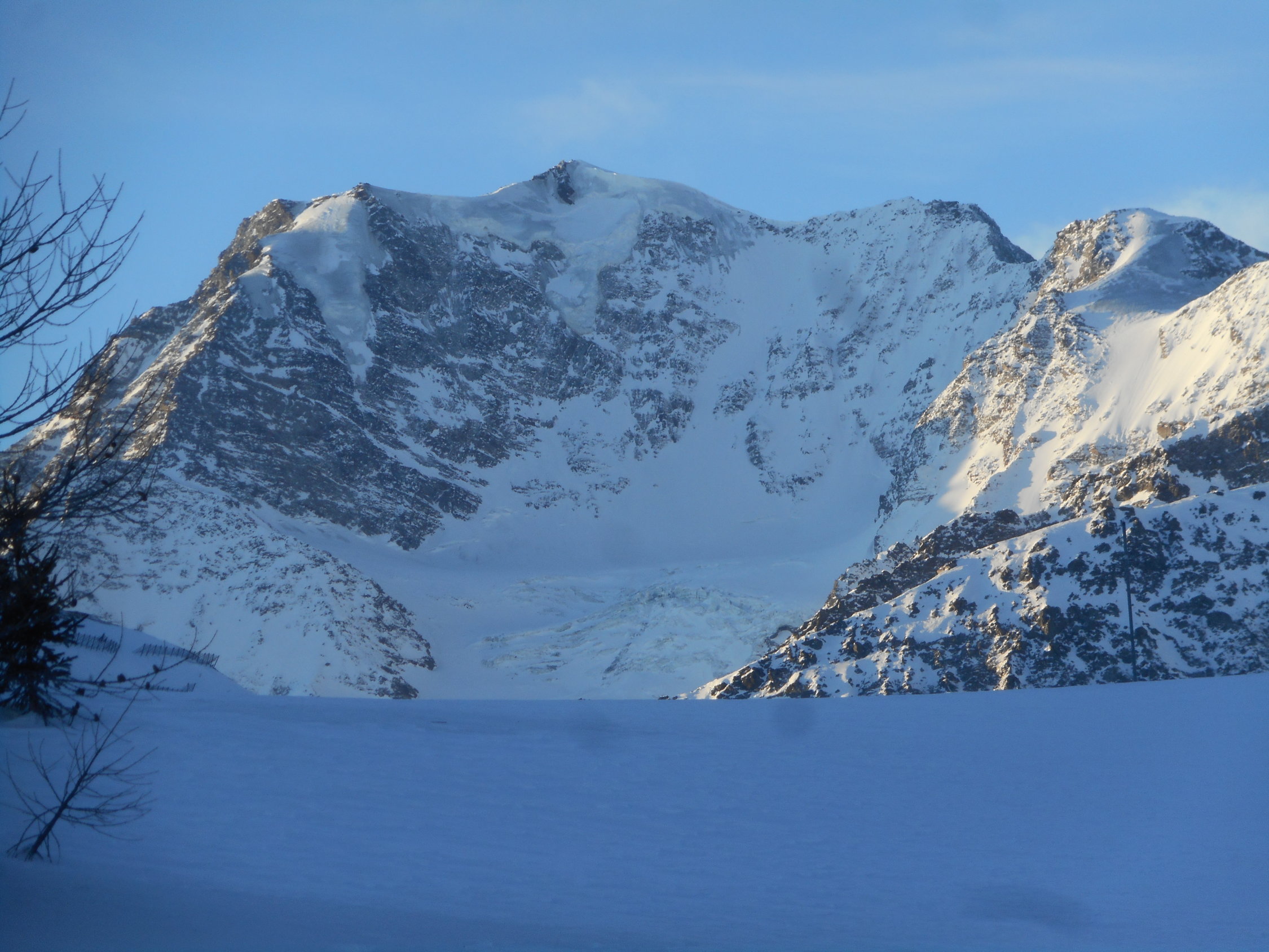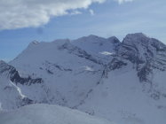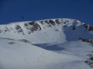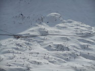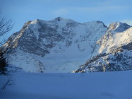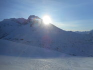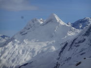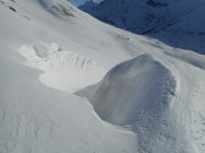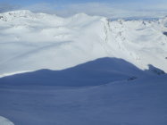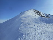 Als Abfahrt wählten wir vom untersten Drittel des Westgrat die Direkt-Abfahrt durch die Nordflanke nach Lengritz. Steilheit 30 bis 35 Grad. Hier hatte es guten Pulverschnee und Firn. Die Direkt Abfahrt durch eins der Couloirs in der Nordflanke war uns zu heikel. Es hatte grosse Triebschnee-Ansammlungen.