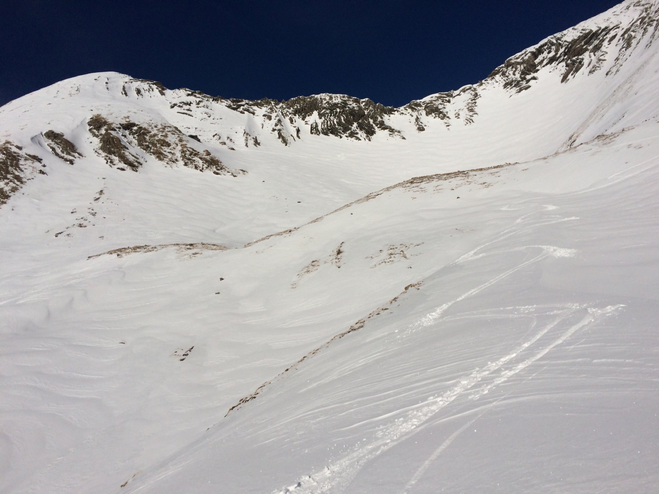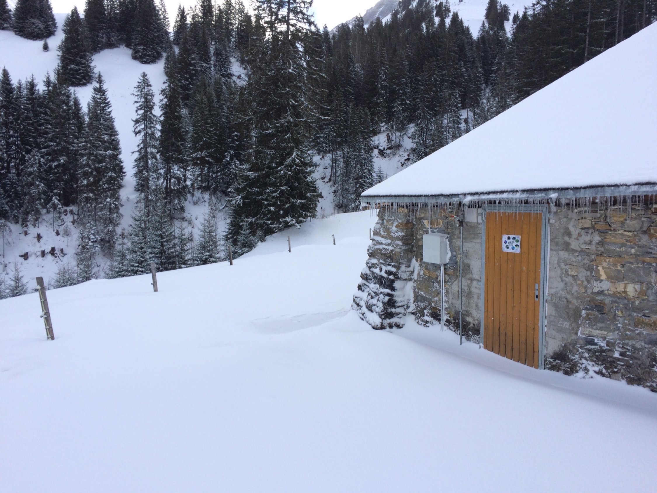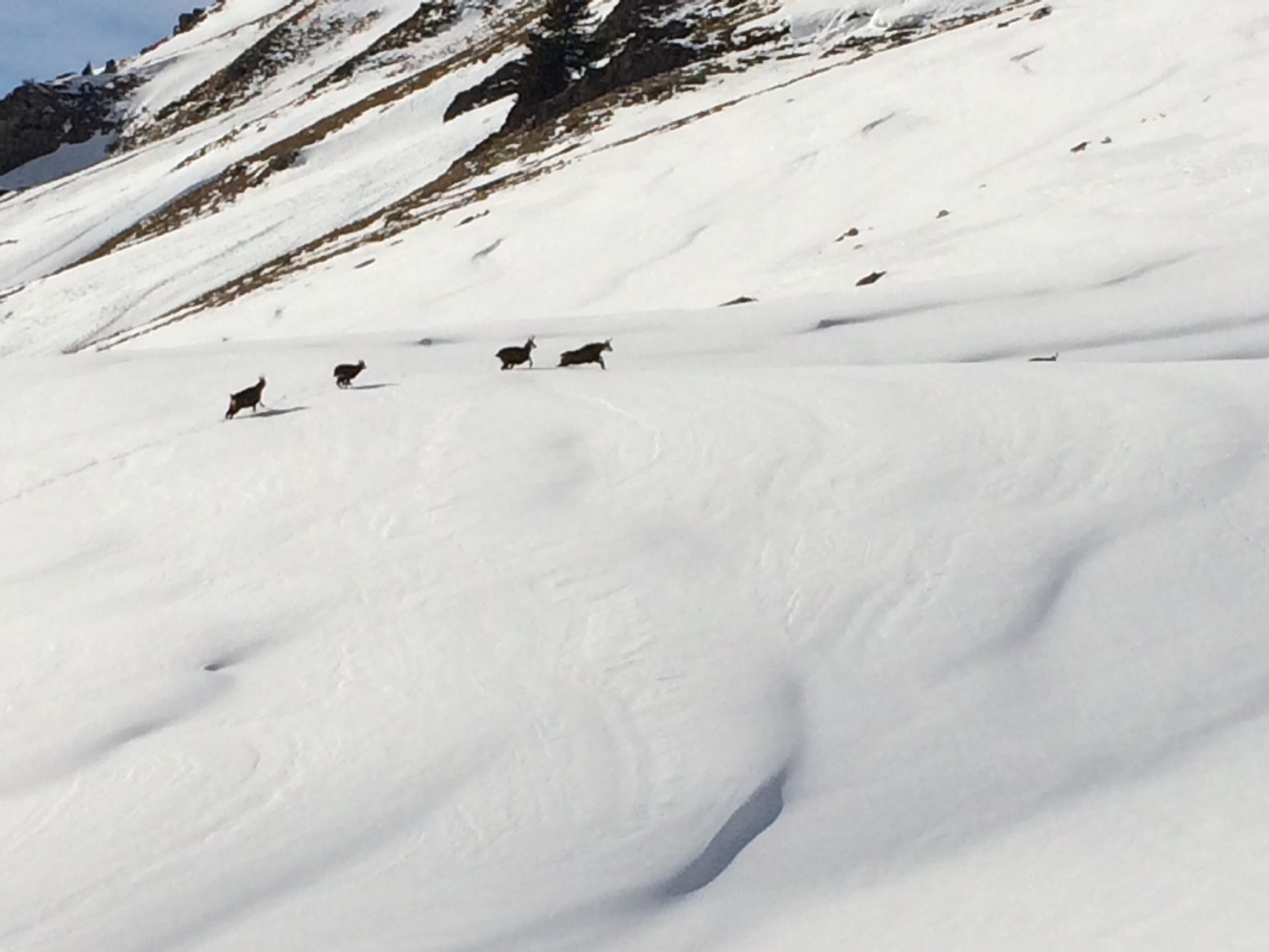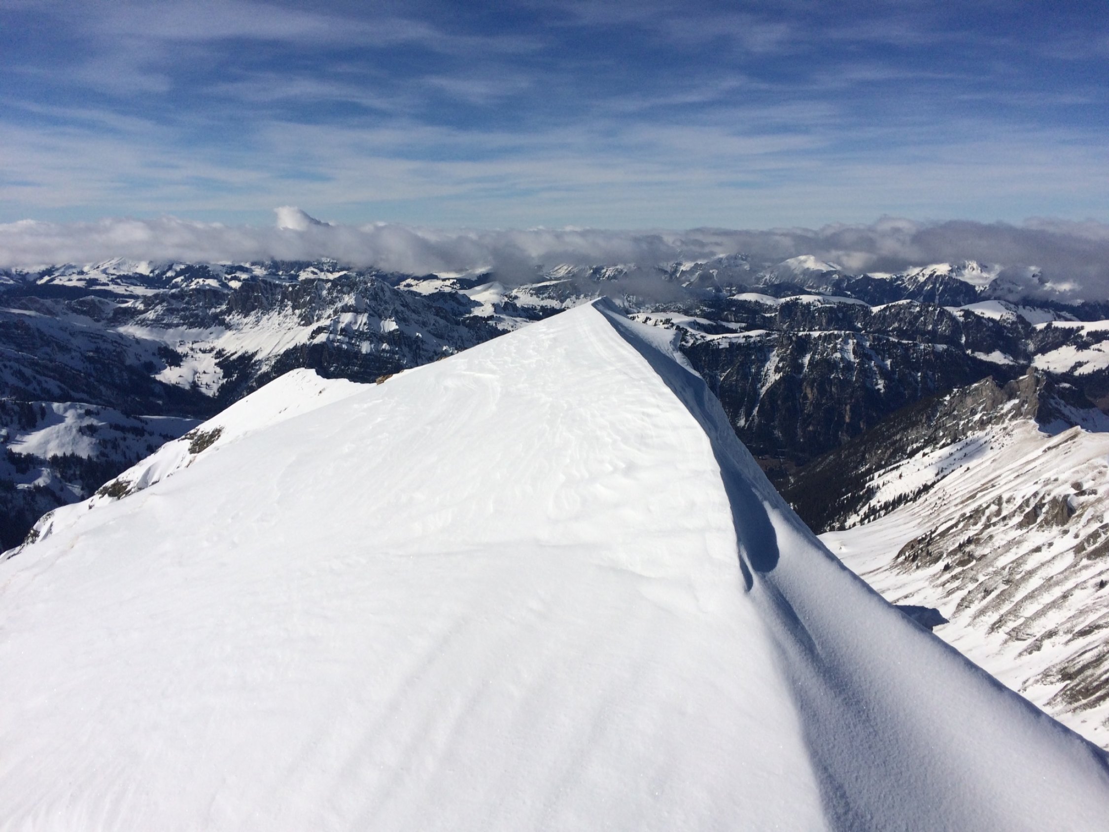 Unten hat es wenig geschneit, circa 5 cm im mittleren Bereich 10cm und oben ca. 20cm Neuschnee, allerdings oben abgeblasen. Ich musste bis zum Gipfel spuren, die letzten 50 Höhenmeter konnte ich mit den Harscheisen nicht mehr gehen und bin gelaufen. Die Abfahrt war nach 100hm wieder OK. Ich habe sogar ein Rudel Gämsen beobachtet -ein Vorteil wenn wenig los ist.