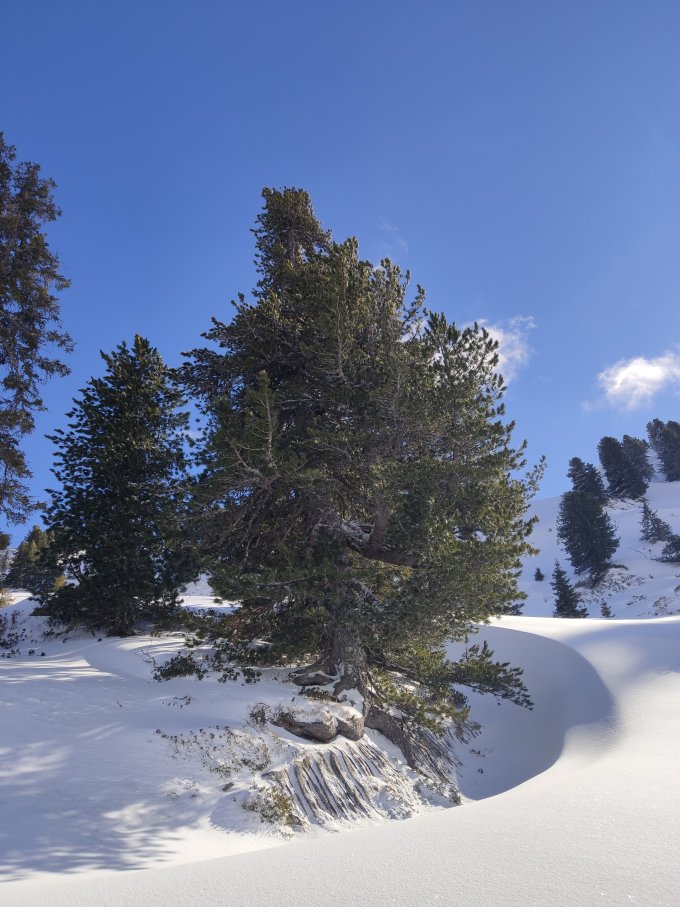 Perfekter Pulverschnee. Oben die letzten paar Höhenmeter vor dem Gipfel ziemlich vereist.