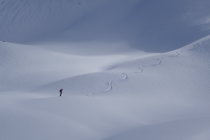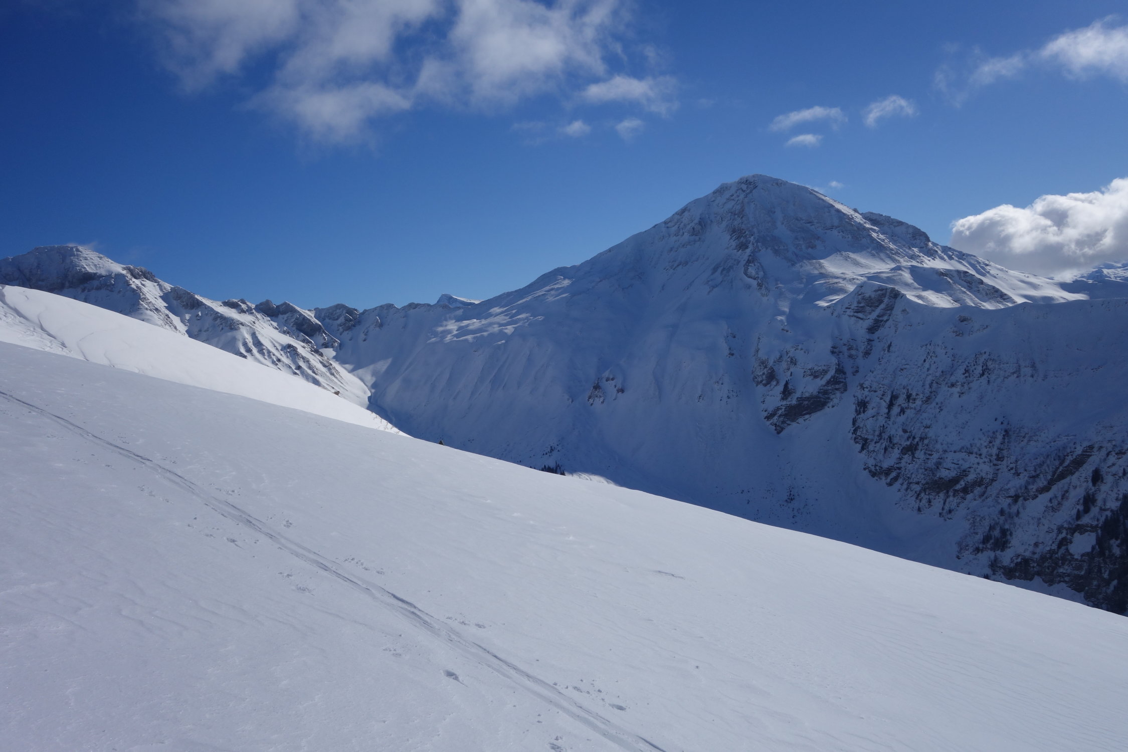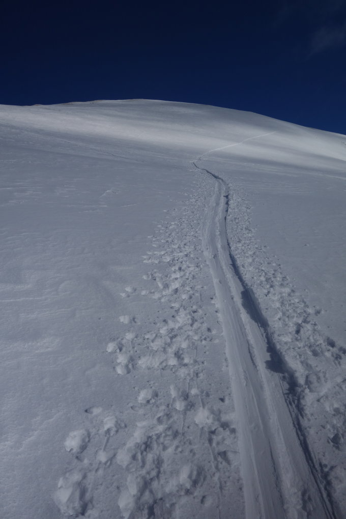 La pente sommitale est fortement soufflée, l'"arrête" est en herbe totale du col jusqu'au sommet. Le reste en neige très dure, et plus on va vers le fameltal mieux c'est ( mais sévèrement au soleil donc c'est déja un vieux souvenir).