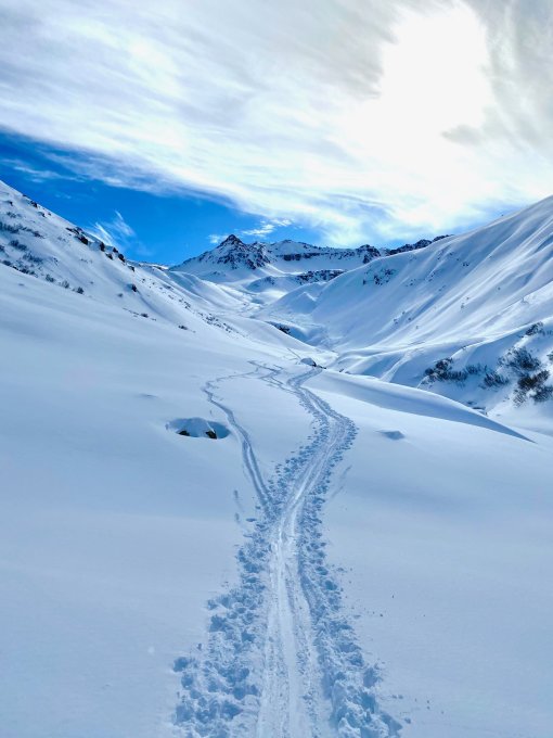 Ca 15-20 cm Neuschnee brachte heute beste Verhältnisse. Spur z.T. etwas steil angelegt, aber gesamte Strecke gut zu gehen. Abfahrt in fahrfreudigem Pulverschnee. An den südlich ausgerichteten Hängen hat der Schnee angefeuchtet - ebenso unterhalb der Alpe Vergalda (1820m).