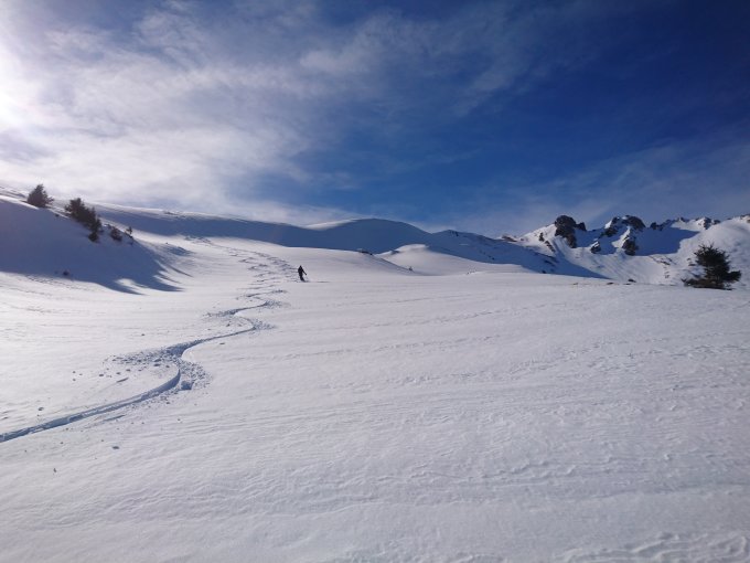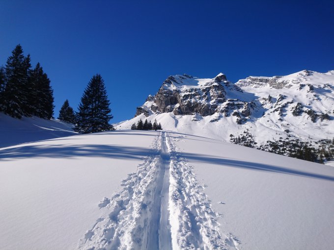 Von der Strassen zu Beginn knapp Schnee, bei der Abfahrt unten kurze apere Stellen. Nach der Waldgrenze ca.20 cm windbearbeitet Pulver, schön zu fahren. Sind im oberen Teil nochmals aufgestiegen und haben unverfahrene Hänge Richtung Schwantelen gefunden.