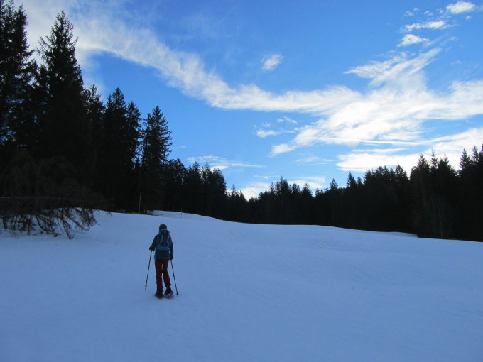 Abstieg über die Alpwirtschaft Zwäcken und ab Müsliegg über den Zwäckentobel nach Brunni. Durchgehende Schneedecke bis nach Brunni. Nach Start bei -4 Grad hatte es mittlerweile 11 Grad plus.