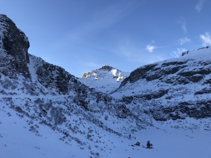 Ich war der erste heute am Aufstieg und da ich alleine war, wagte ich die Traverse unter dem Unter Chärpf hindurch nicht und bin in die Mulde hinunter gefahren - eine Nachfolger-Gruppe traversierte und spurte später unter dem Unter Chärpf ohne eine Lawine auszulösen.