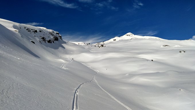 Abfahrt bis oberhalb Guwhütte in Pulverschnee (trockener als tagszuvor in Safien Platz), ab Guwhütte schwerer aufgrund der hohen Temperaturen.