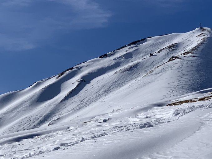 Sehr verfahren, Osthänge pulvrig, Südhänge von der Sonne „bearbeitet“. Bin dennoch vom Gipfel das rechte, noch unverspurte Couloir der SO-Flanke abgefahren. Toll, trotz der leichten Kruste.