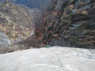 Hammerroute mit sportlicher Absicherung, anhaltenden Schwierigkeiten und knackiger Bewertung. Gutes Können auf Reibung und in technischen Boulderstellen nötig, sowie auch das Gemüt, dieses jenseits vom letzten Sicherungspunkt zur Anwendung zu bringen. Wäre diese Tour im Yosemite, würde sie endlos gehypt. Im Onsernone interessiert sie (fast) keinen.