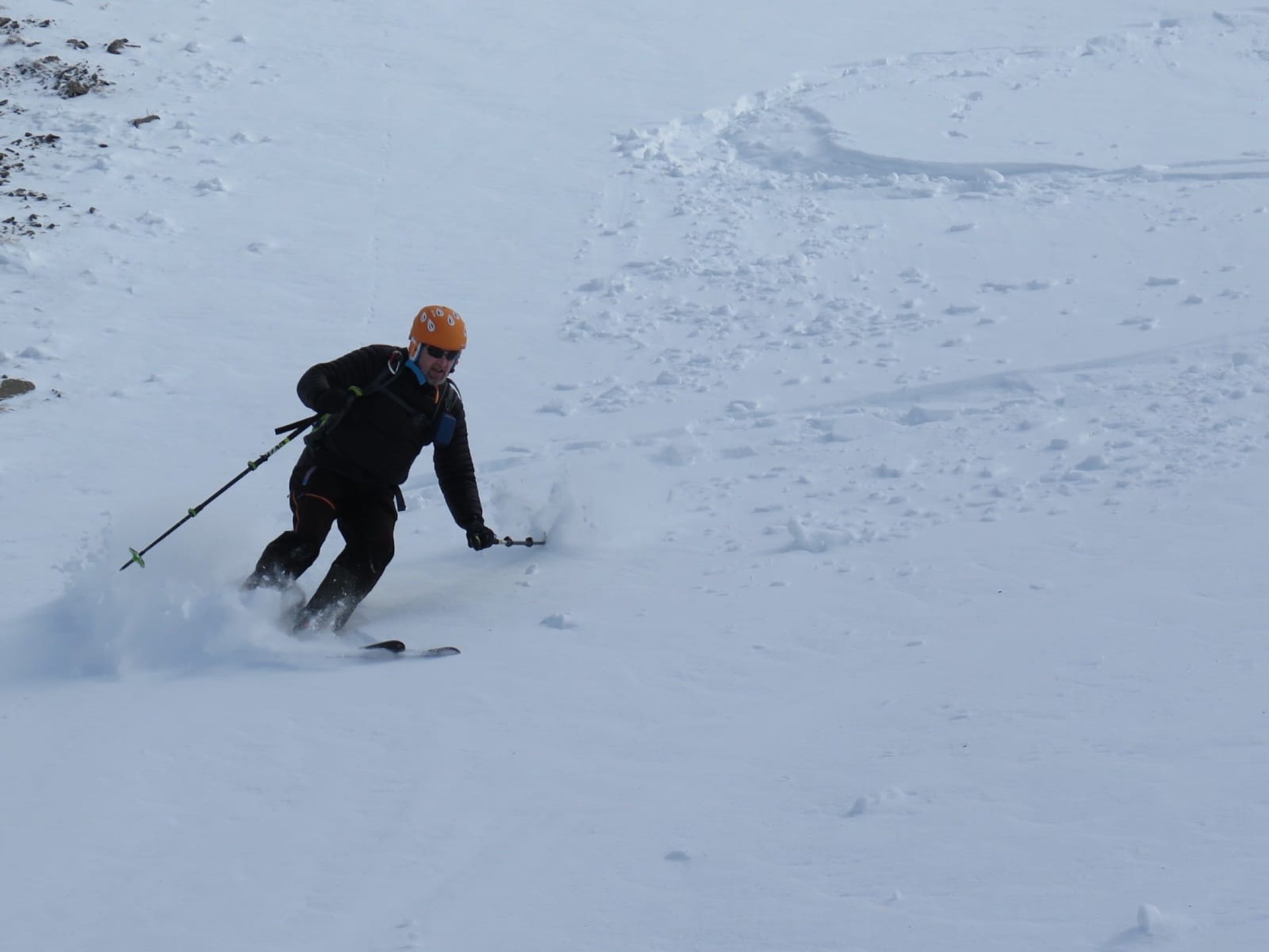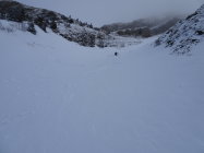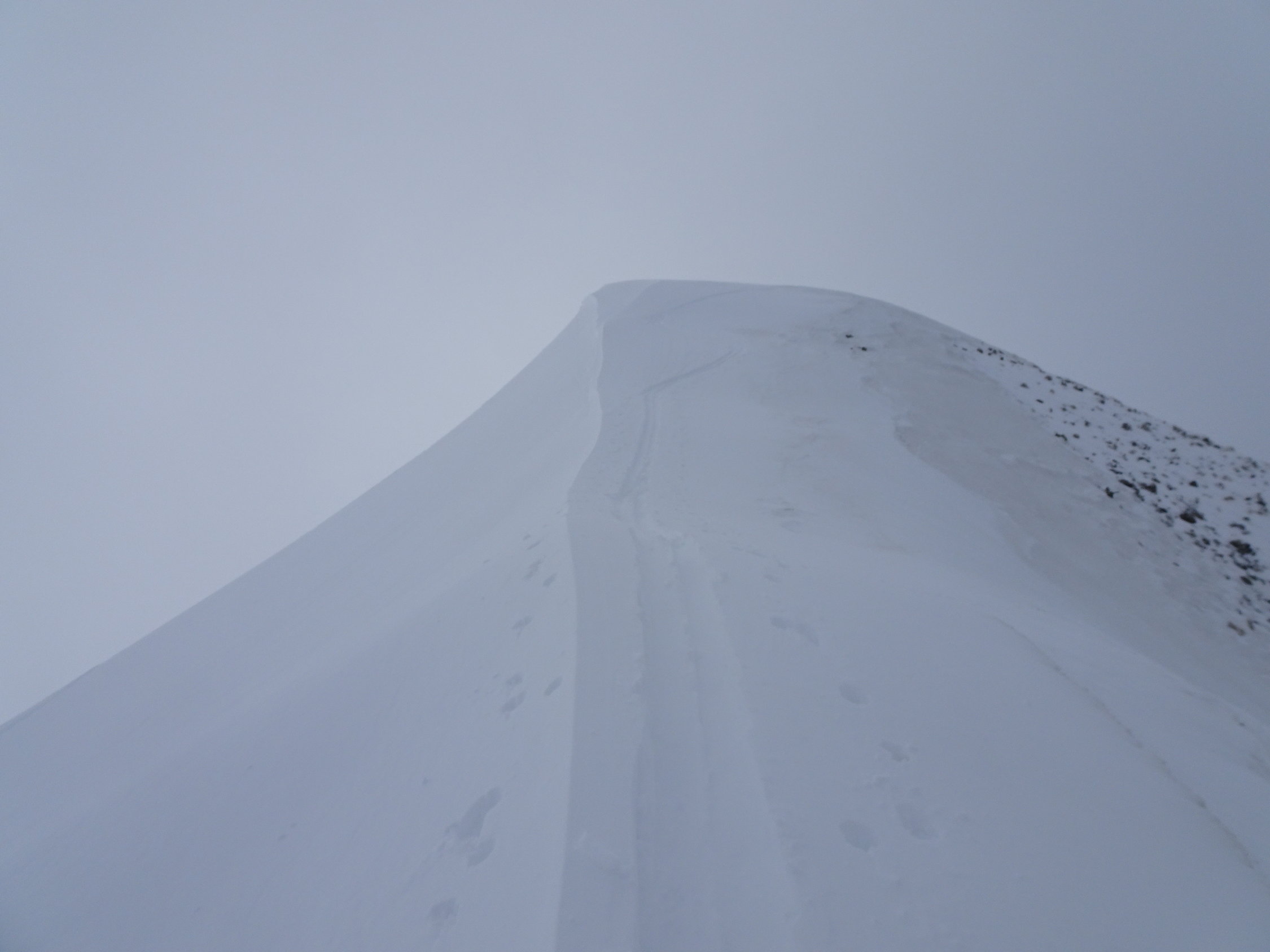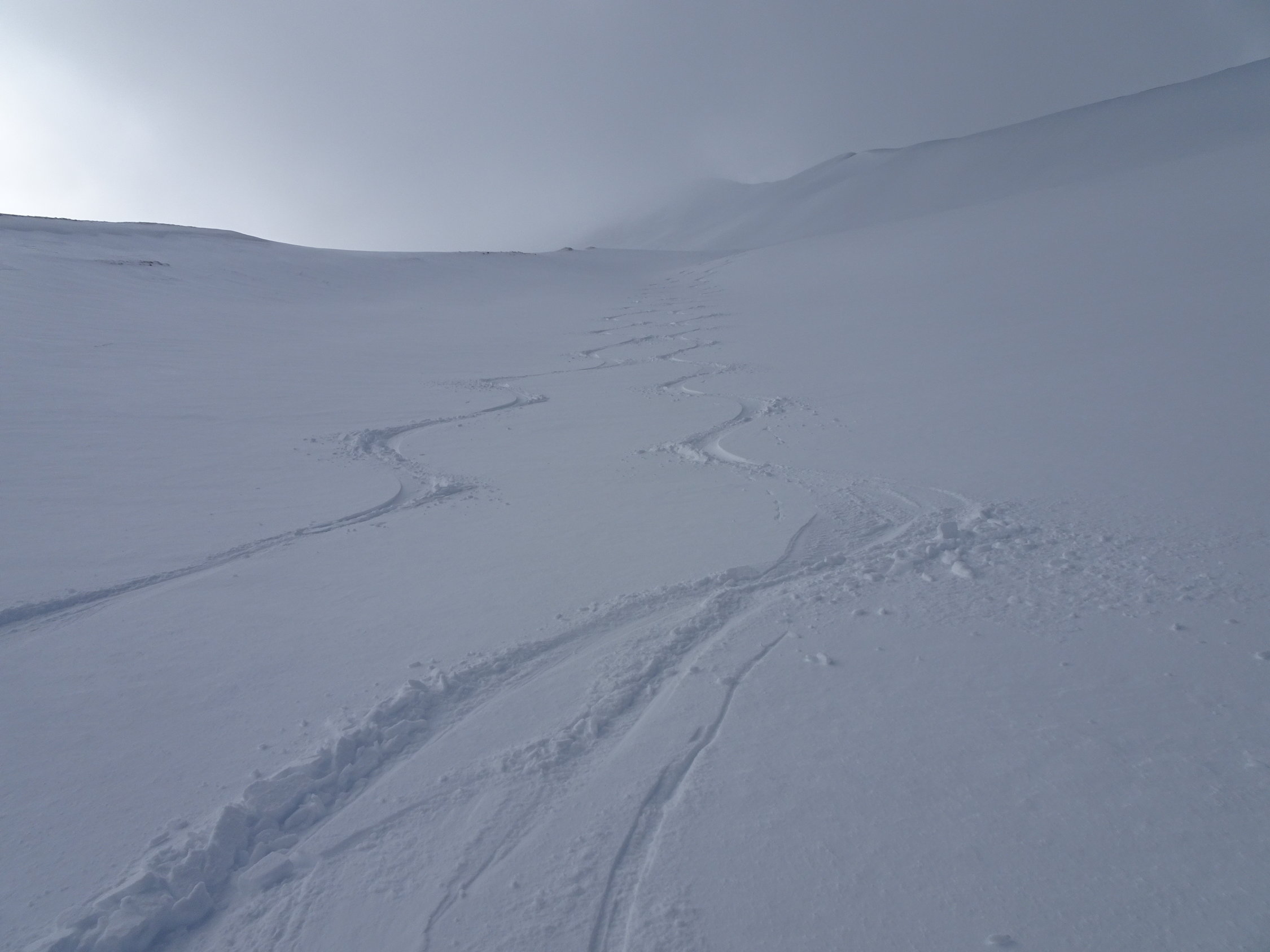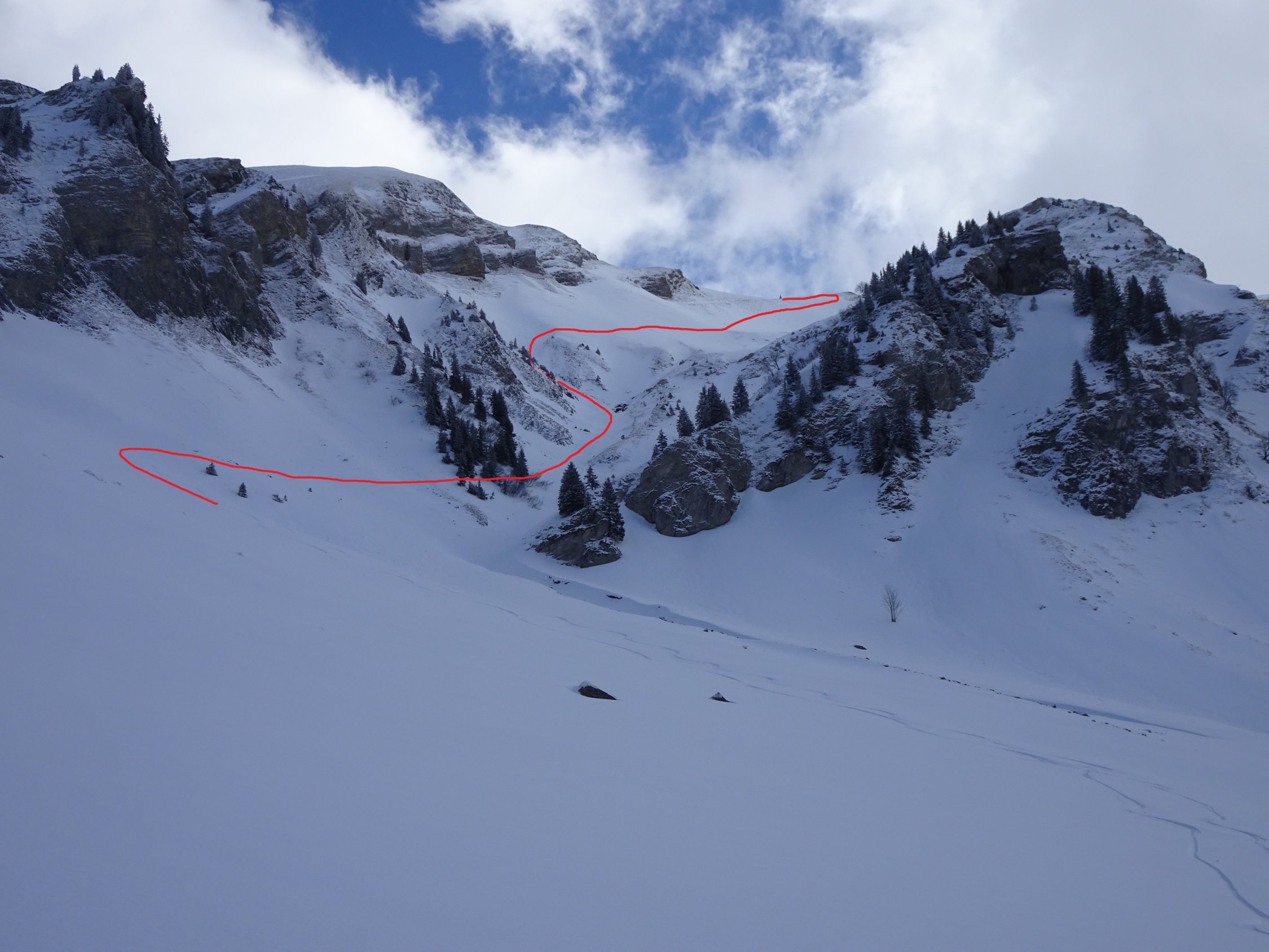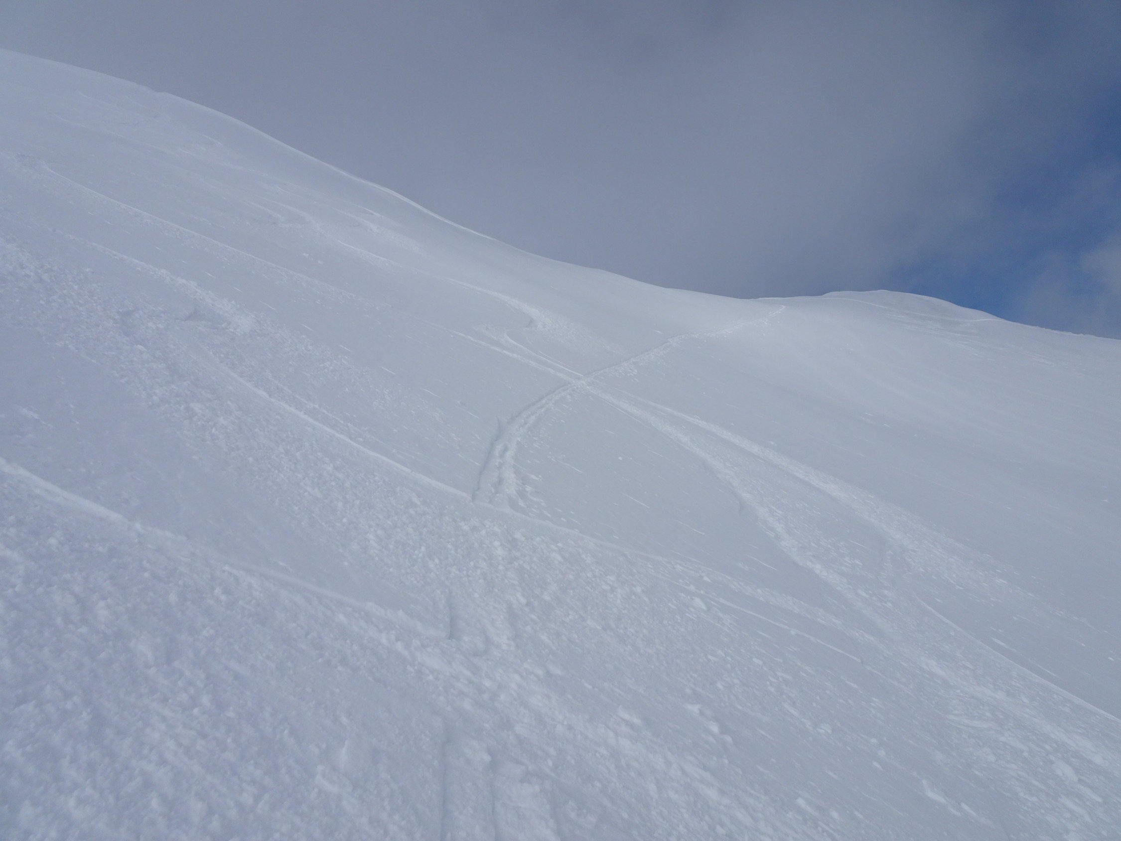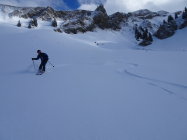 Vom Gipfel zuerst kurz dem NNO-Grat entlang. Dann einfahren in die Ostflanke bis Pt.1956m. Erneut anfellen und aufsteigen zum Sattel(grosser Steinmann)2067m. Die ersten paar Meter wegen abgeblasenem Schnee zu Fuss. Nun die steilen Hänge von Wandelen rechtshaltend hinunter bis zum Couloir ganz rechts(in Fahrtrichtung). Das bis 45 Grad steile und teilweise enge Couloir hinab. Hier braucht es viel Schnee wegen dem darunter fliessenden Bach(Heute waren die Bedingungen perfekt). Danach wird es flacher(Abendweid) und man erreicht die Route vom Arnihaggen. Über Pt.1418m, Zopf, nach Arnischwand 1373m und zur Strassenkurve bei Pt.1378m. Der Strasse entlang zur Rothornbahn-Talstation.