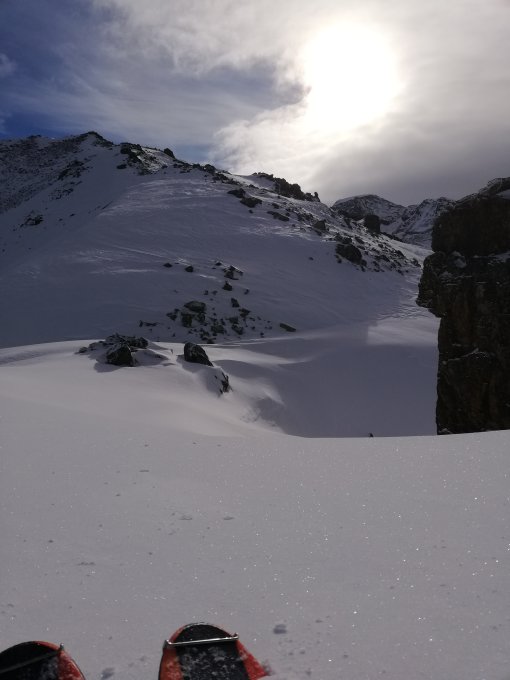 Im Aufstieg sind evt. an einer Stelle Harscheisen zu empfehlen. Nach Malächij, dort, wo man zwischen oder unter Felsen traversieren muss.
