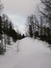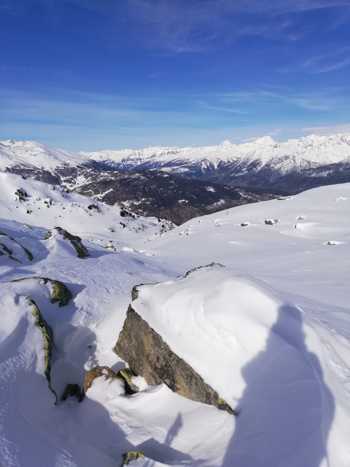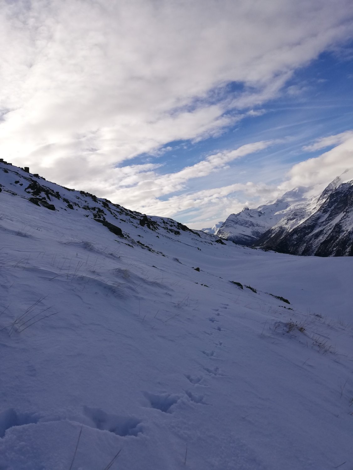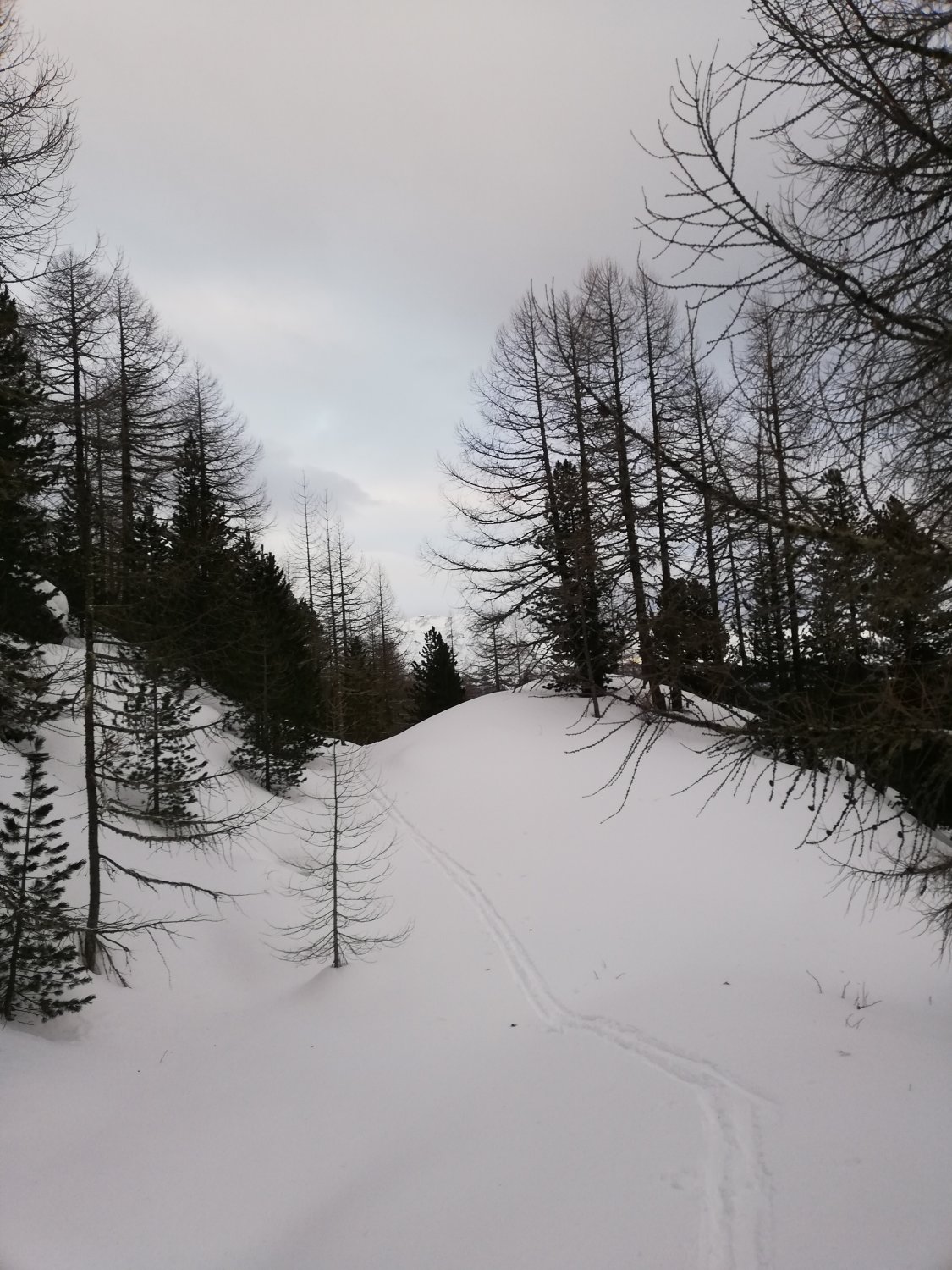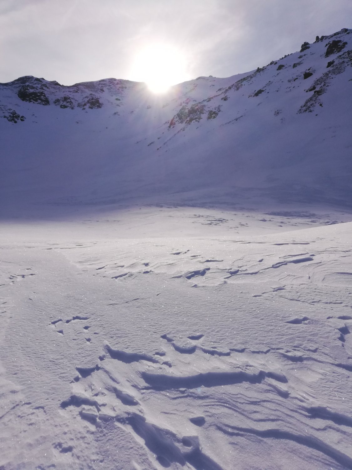 Perfekter Pulverschnee in der Abfahrt! Welch eine Überraschung. Keine Menschenseele weit und breit. Abfahrt einige Meter zurück auf der Abfahrtsroute, dann nördlich abfahren in die Rosschumme.