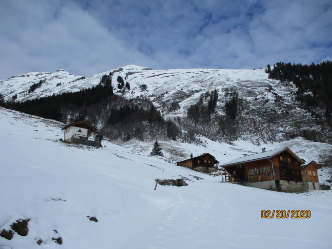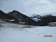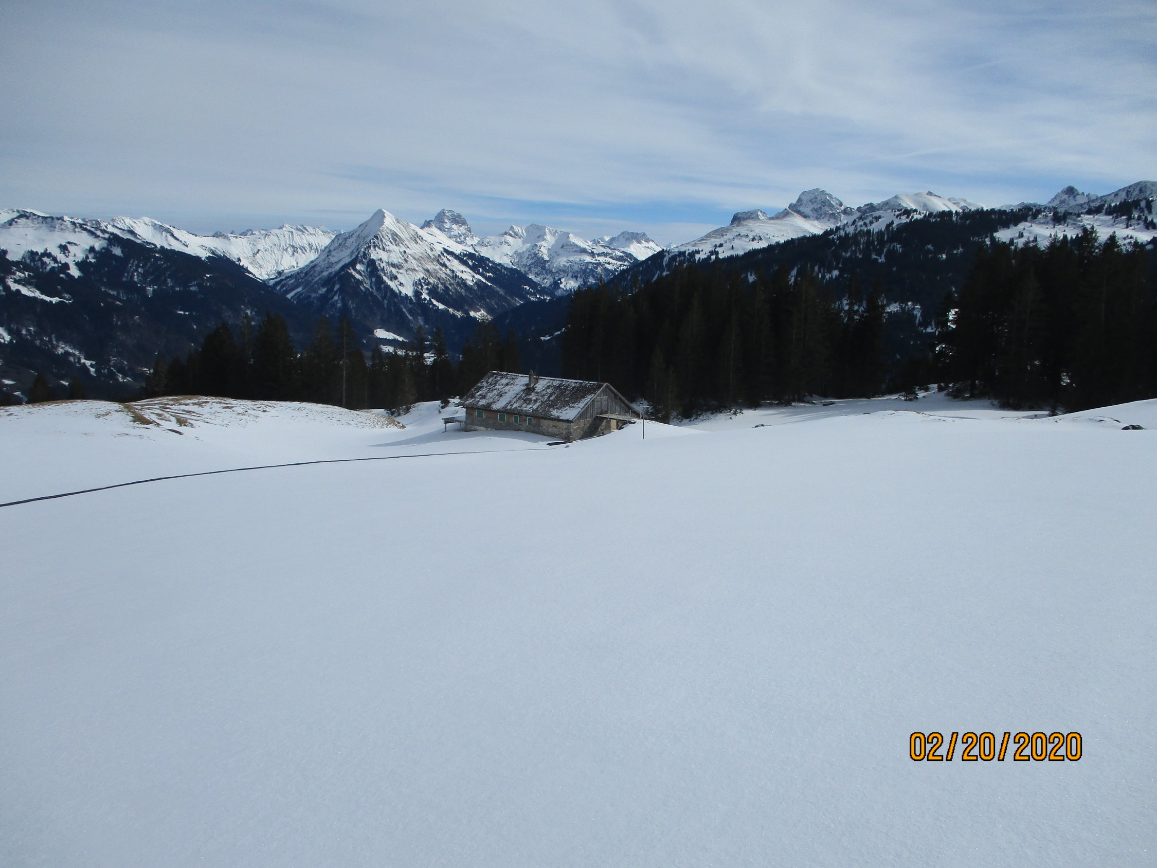 Ich bin nicht, wie in der Kompaß-Karte eingezeichnet, dem Sommerweg durch die Flanke des Hohen Stoß hindurch zur Hofstätten Hütte gefolgt, da mir dies recht heikel erschien. Ich bevorzugte die Mulde zwischen besagter Flanke und der Wurzachalpe, die bei der Kanisalpe auf einen Fahrweg trifft, über welchen man zur Bergstation Rosstelle gelangt. Der Sommerweg hinab nach Mellau beginnt laut Kompaß-Karte orographisch links des Bergrestaurants Simma, doch in Wahrheit beginnt er rechts davon. Im ungespurten Zustand ist dieser schwer zu finden und auch schwierig zu halten. Insgesamt rate ich von der Begehung ab, zumal ich dann am unteren Ende von einem Schild mit der Aufschrift "nur im Sommer begehbar" empfangen wurde. Theoretisch sollte bei genügend Schnee ja eine Talabfahrt von der Bergstation hinab nach Mellau bestehen, allerdings habe ich keine Vorstellung davon, wo diese verlaufen soll. Es bleibt aber immer noch die Variante, für die Rückkehr ins Tal die Seilbahn zu benutzen.