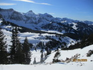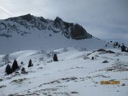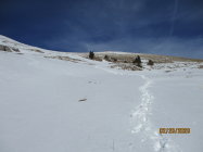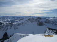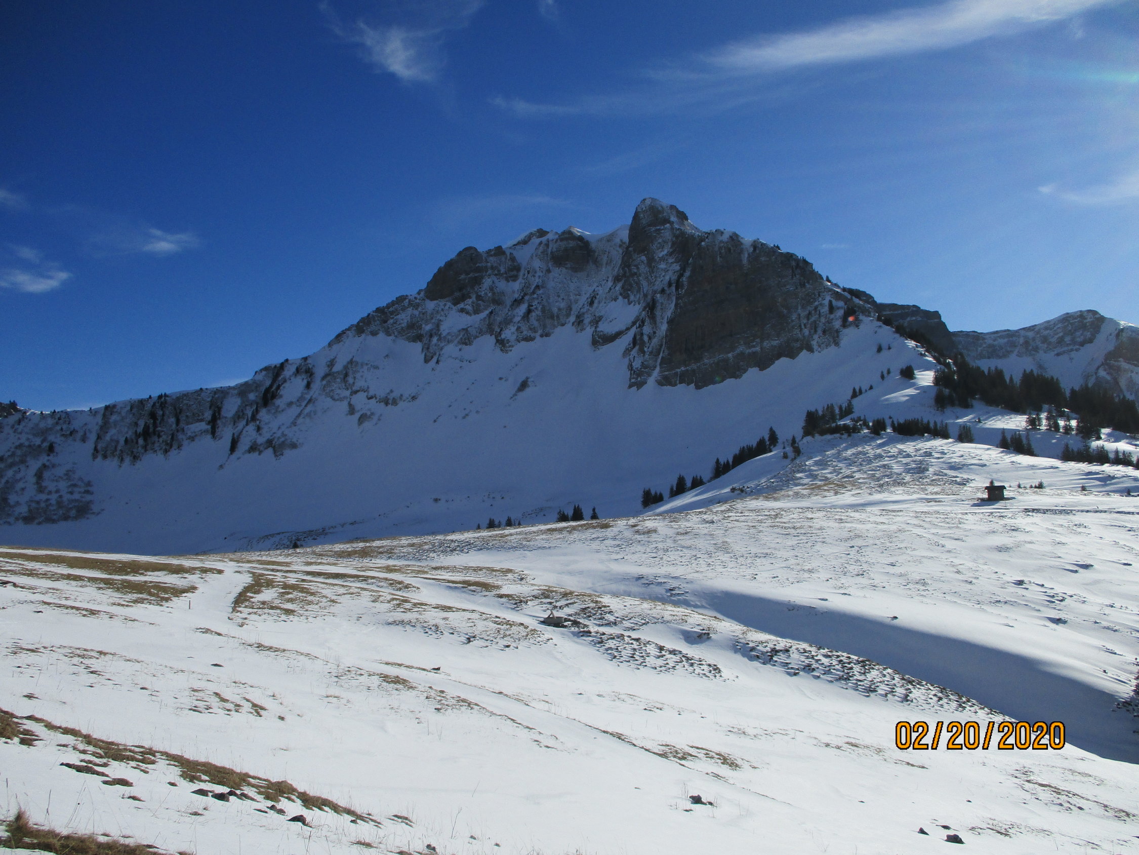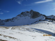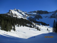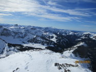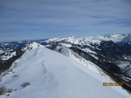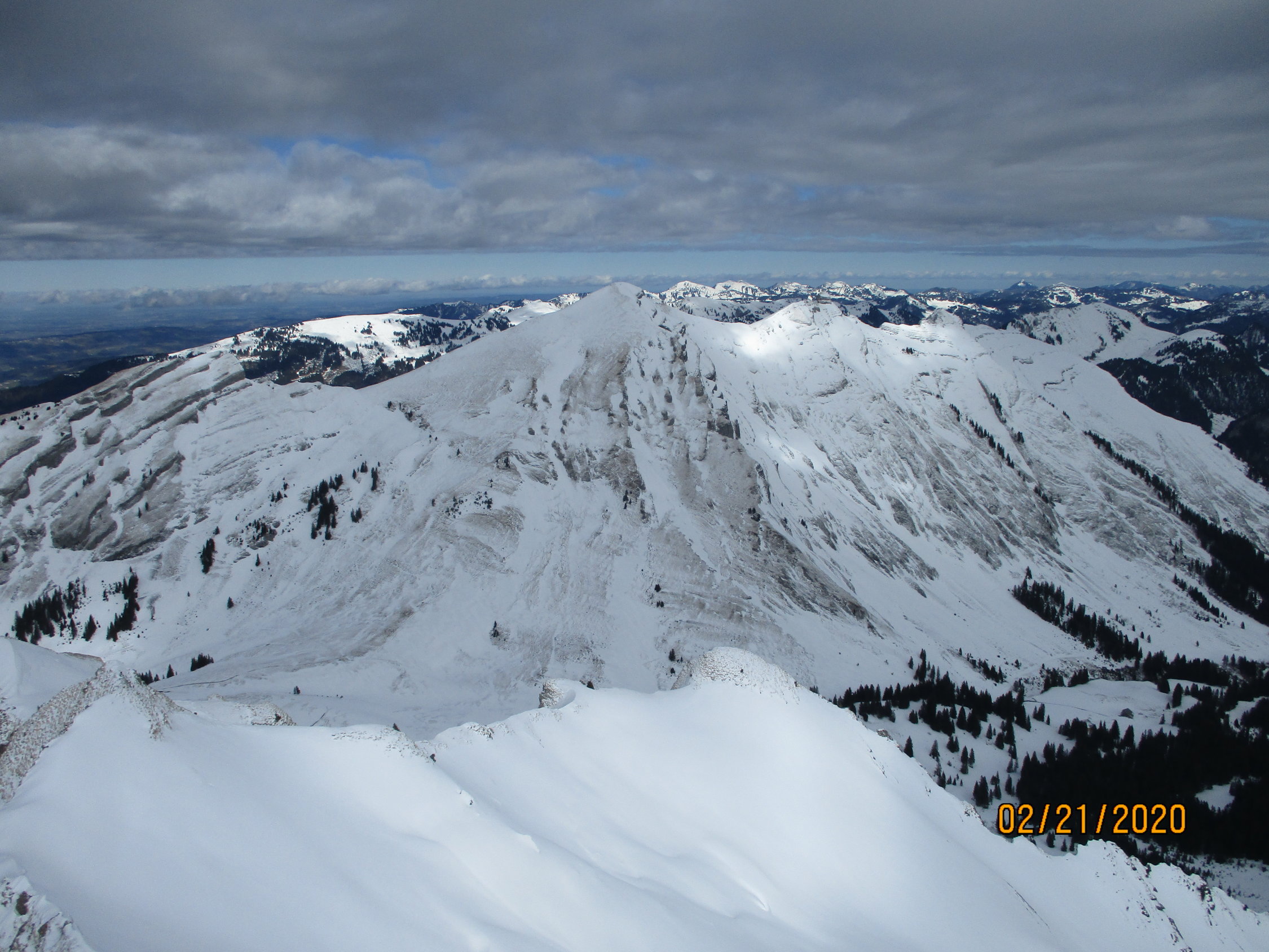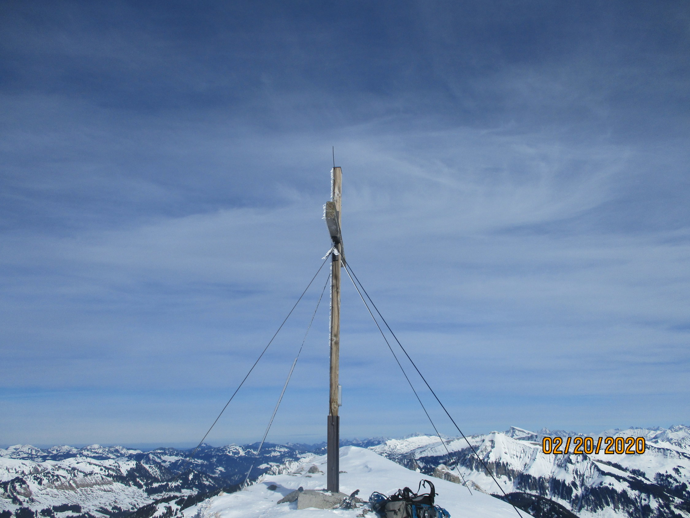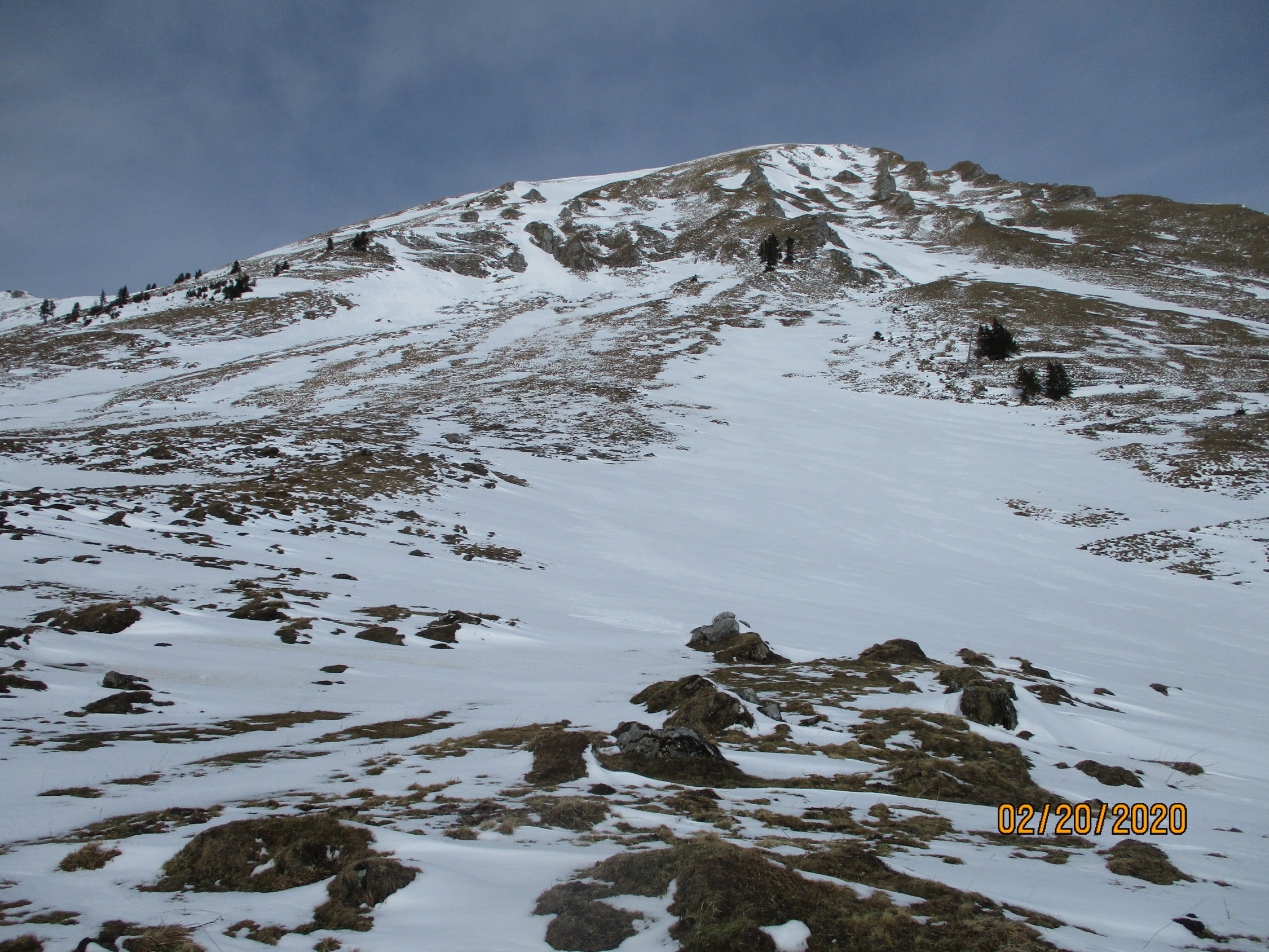 Einsatz der Schneeschuhe somit erst ab etwa 1100 m. Den Gipfelhang stieg ich fast aper hinauf, fand aber für den Abstieg dann eine Schneeschneise direkt unterm Sattel im Westgrat, wobei ich An- und Abstieg ohne Schneeschuhe gemacht habe.