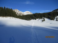 Ob die Verhältnisse als gut, oder als nur mäßig zu betrachten sind, hängt ab vom Ansinnen, mit welchem man unterwegs ist. Wer, wie ich, eine Gipfeltour in herrlicher, einsamer und wilder Gebirgslandschaft erleben möchte, und wem die Schneeschuhe dabei nur als zweckerfüllendes Werkzeug zur Bewältigung der Tour dienen, wird die Verhältnisse als "gut" bezeichnen. Wer eine Schneeschuhtour mit dem Erlebnis Schnee als Priorität erleben möchte, wird die Verhältnisse alllenfalls als "machbar" bewerten.