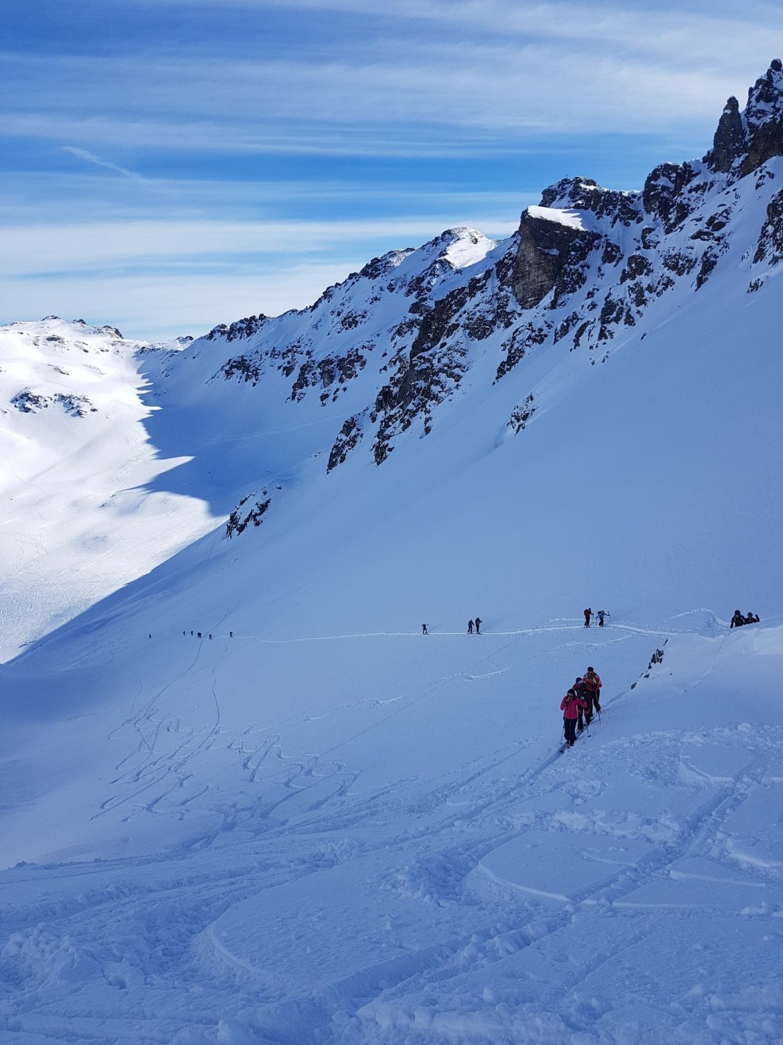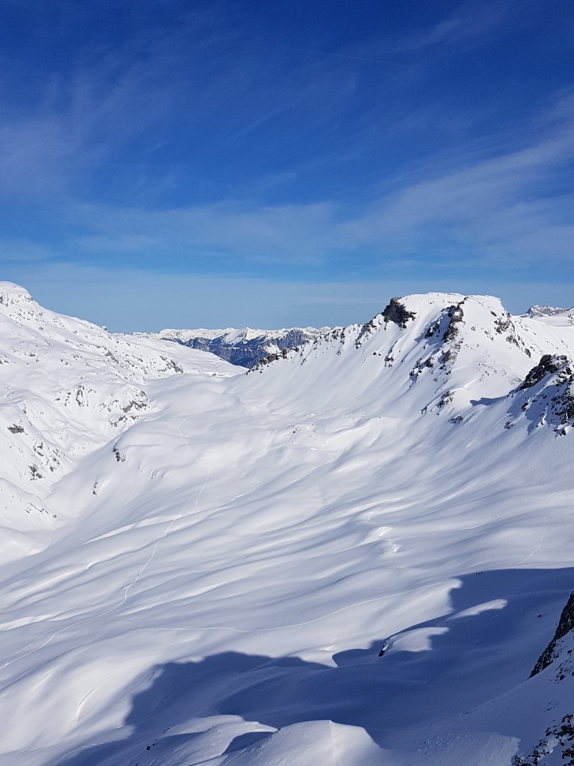 Zuerst Aufstieg auf Rotspitz, steife, kalte Bise - aber grandiose Sicht. Dann Abfahrt
