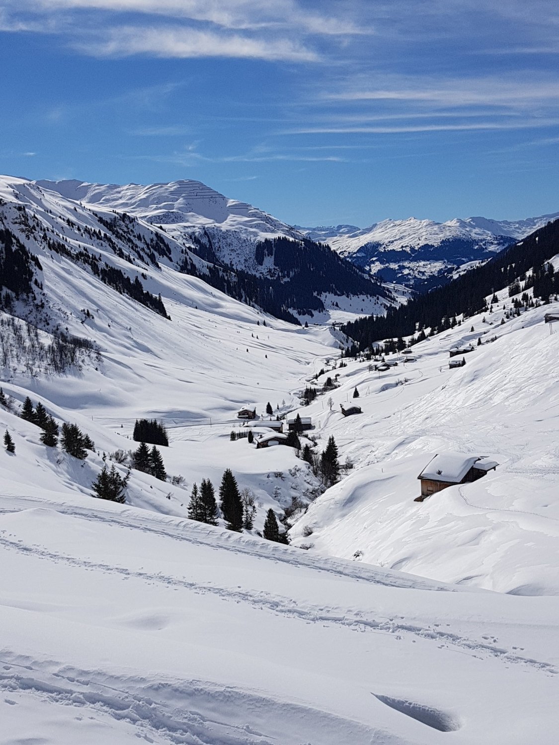 Gute Schneeverhältnisse in St.Antönien. Wir haben uns "pro Pulverschnee - Aufstieg im Schatten u. kalt (nordseitig) gegen "Sonne pur" u. damit evtl. sulzigen Schnee (Girenspitz,Schafberg) entschieden: u. wir wurden richtig gut belohnt