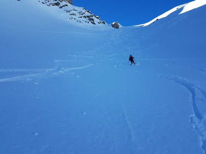 Die Abfahrt gegen das Telli bot oben wunderbaren Pulver an. Das Coulior hatte viel alte Spuren, Schnebollen und etwas drückbaren Bruchharst, ging aber recht gut. Unten hatten wir dann schönen Sulz, welcher aber anfangs noch etwas zu führend war, in grossen Bögen aber genussvoll fahrbar.