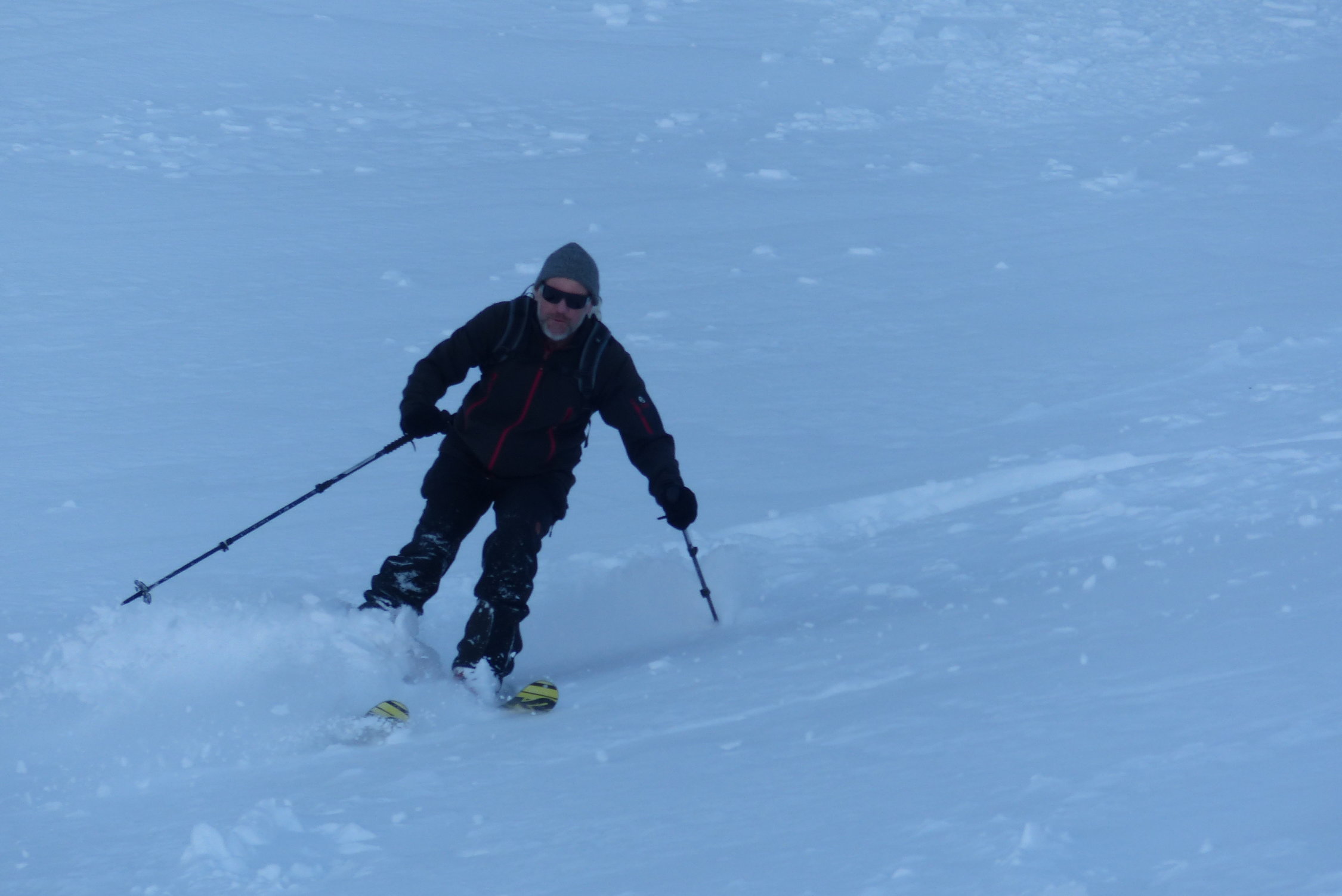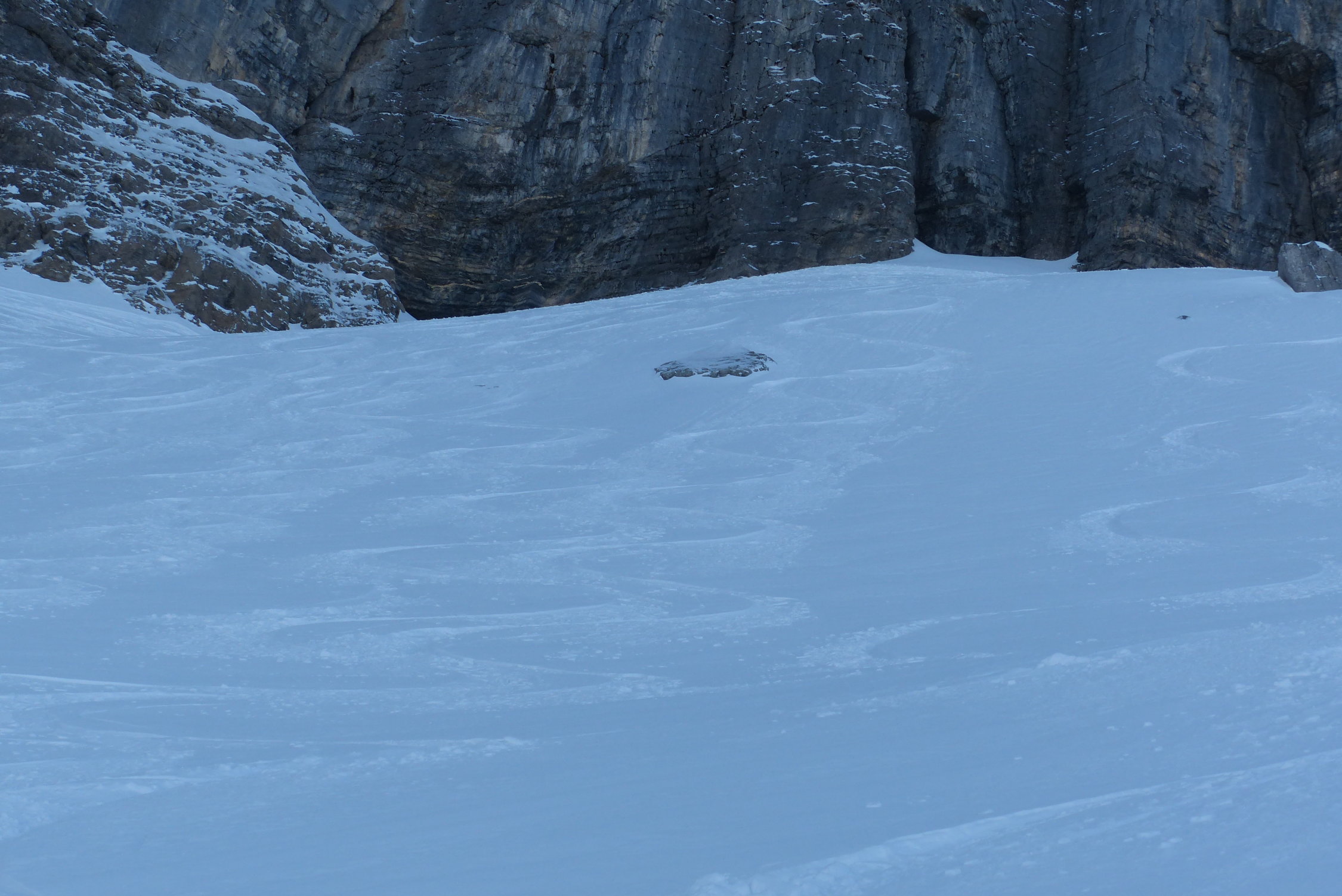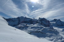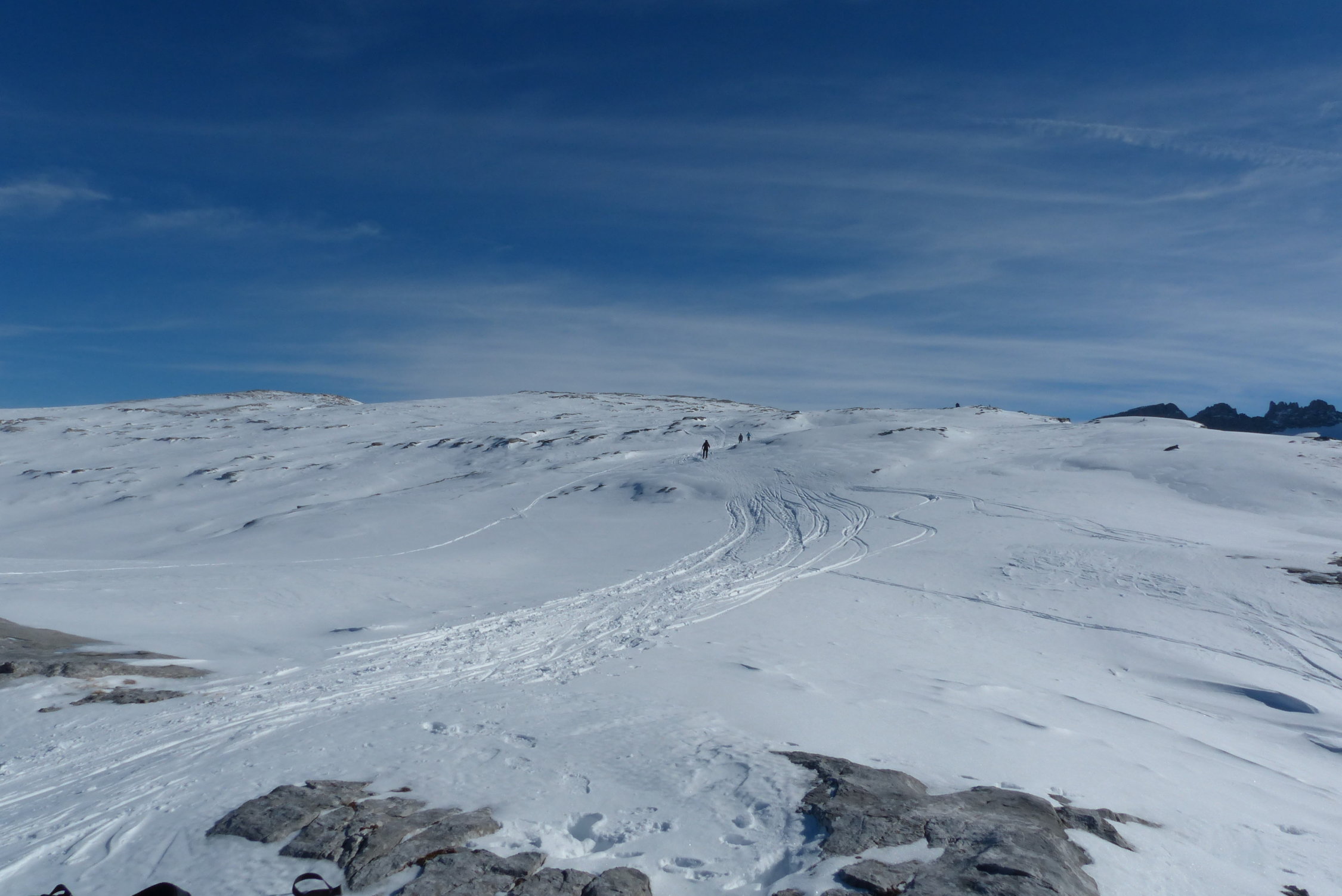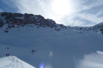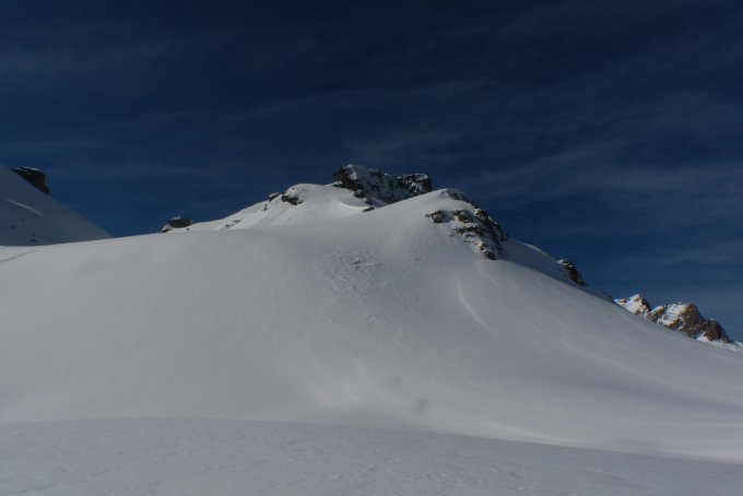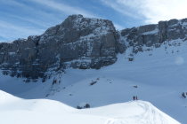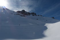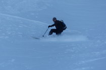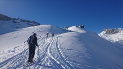 Die Zusatzschlaufe Richtung Gipfel - nach Wächtersbutzen ist landschaftlich einfach schön, es zieht sich noch - auf dem Hochplateau ist der Gipfel noch nicht erreicht. Hier war der Schnee abgeblasen und es ist auch wenig vorhanden.Am Gipfel um 12.30 dann recht starker Südwest Wind. Abfahrt diesmal nach Schuechällen ganz östlich mehrheitlich traversiert, dann immer rechts haltig Richtung Gwalpeten. Der Schnee ganz oben leicht Windharsch, dann schwerer Pulver - drehbar. Unterhalb 1900 dann auch ganz schöne Pulverpassagen.Bei Gwalpeten östlich haltend oberhalb Spitzbäch in den Weg und retour.