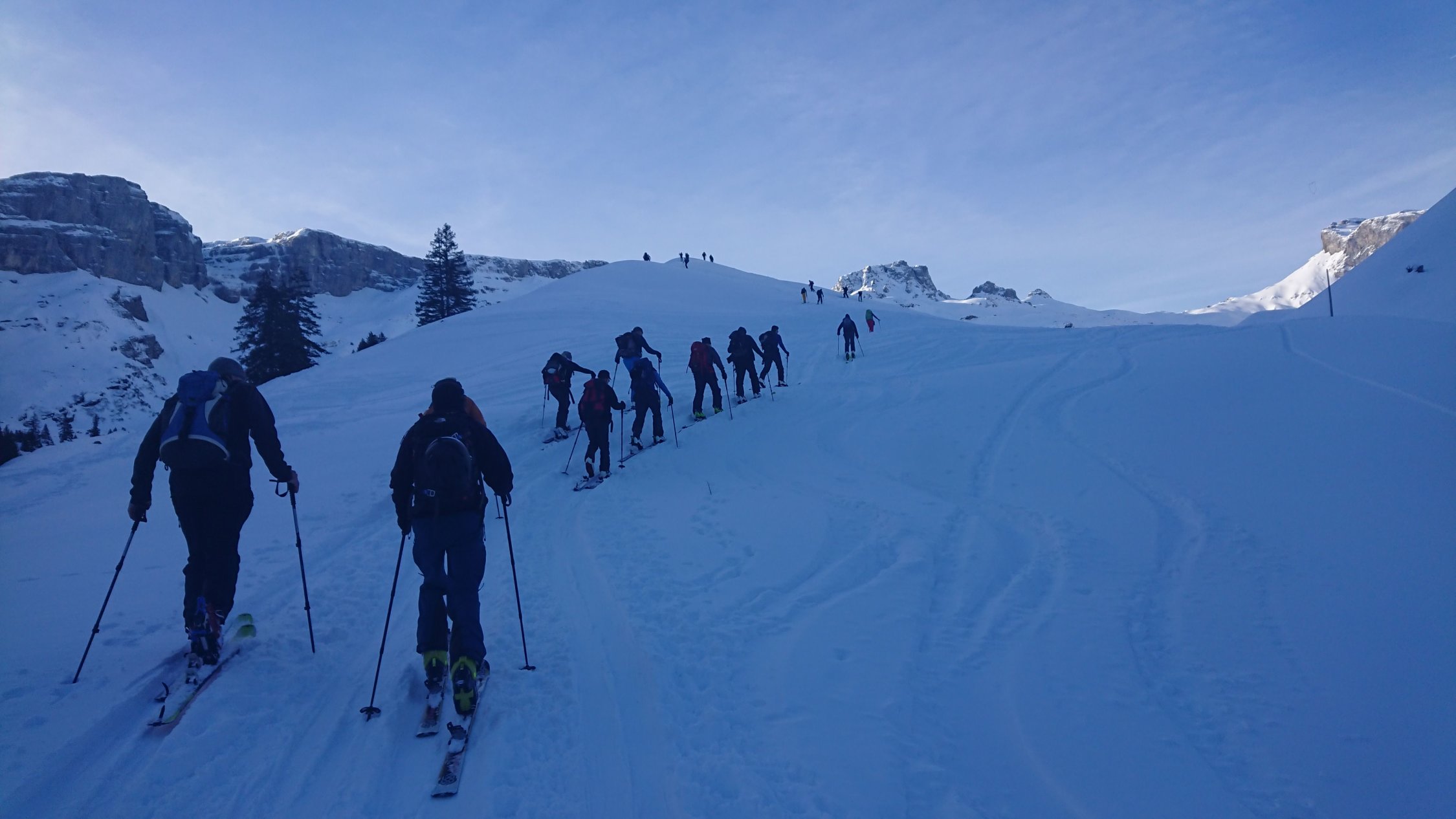 Die Spur war perfekt, griffig , weicher Neuschnee, gute Spuranlagen von Unten bis zum Gipfel.Im Bereich Munggenband sehr gut Spuranlage, war auch schon tiefer angelegt. Diese ist perfekt. Wir Starten im Sali diesen prachtvollen Skitouren Tag und waren natürlich nicht die einzigen mit diesem Gedanken.