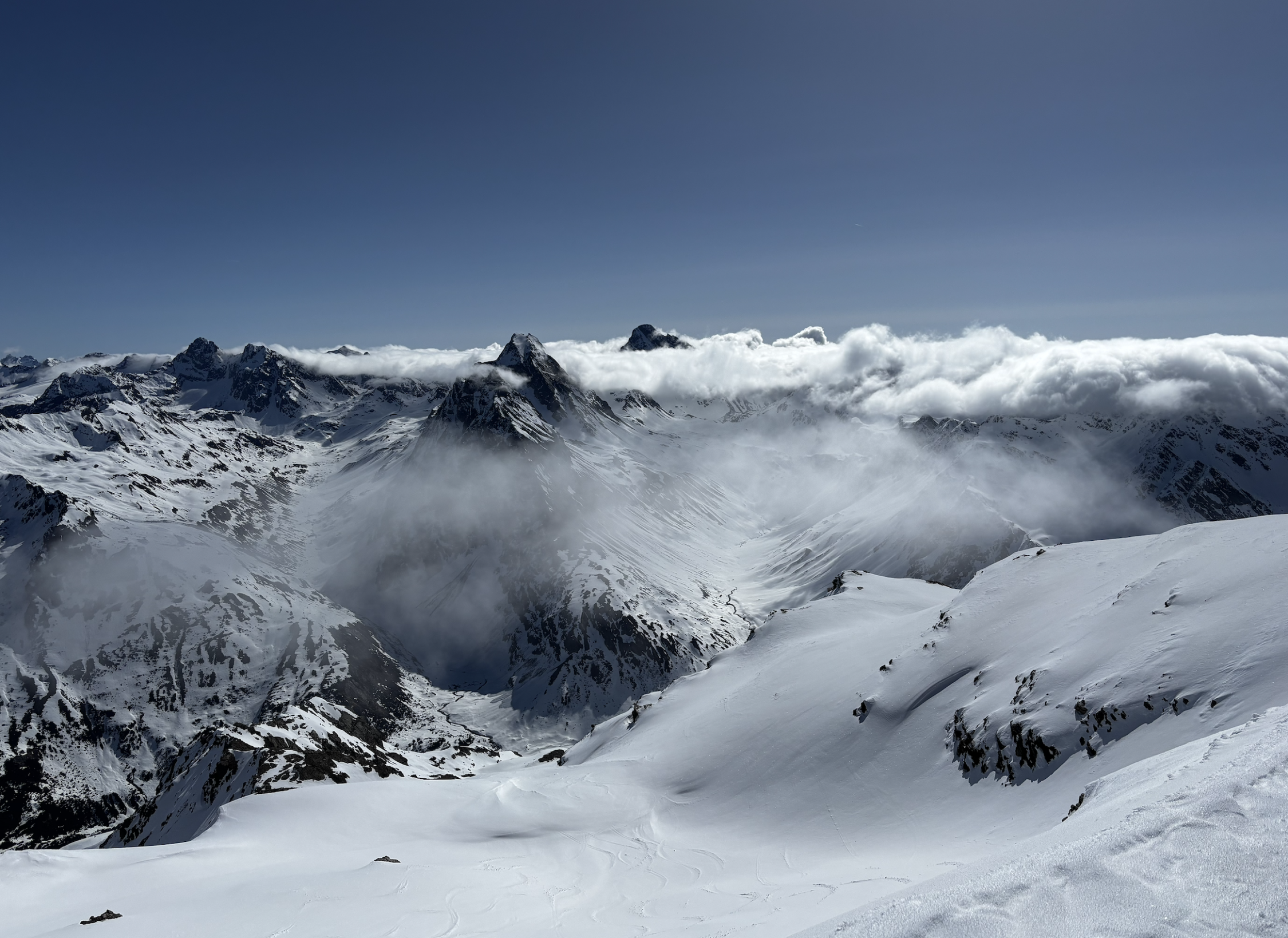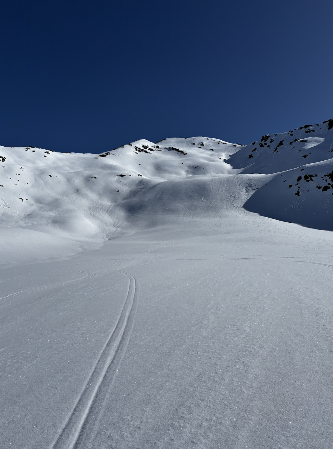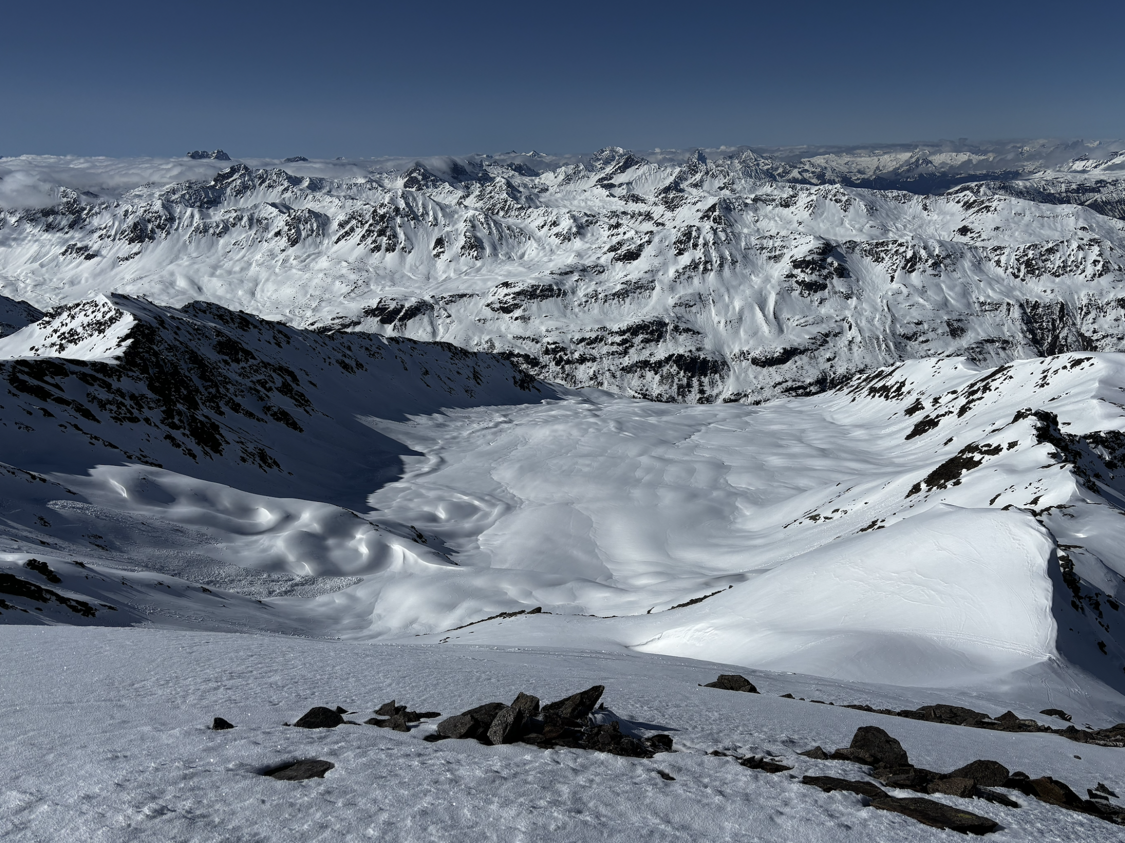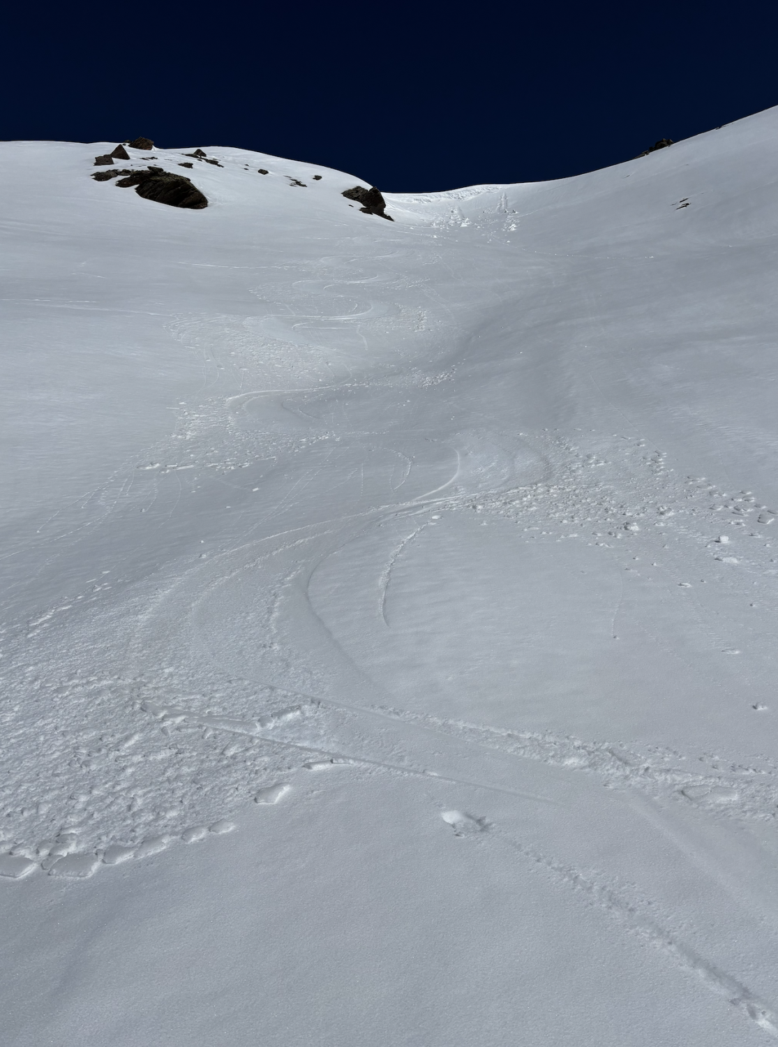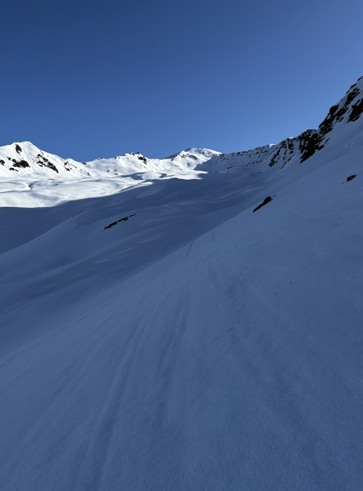 BINGO ! Die Abfahrt um 10:15 Uhr vom Gipfel war ein Traum ! Am Morgen aber war der Blick vom Parktplatz Tschuggen auf die unteren Südhänge vom Tschuggenbärg sorgenvoll. Geht sich eine durchgehende Schneelinie aus ? Nicht ganz - 2 Mini-Tragestücke brauchte es. Aufgrund fehlender Abstrahlung in der Nacht, gab die ersten 150 Hm die nur angefrorene Schneedecke unter den Schritten Stellenweise nach. Ab ca. 2100 m dann durchgehend harte Schneedecke und ab ca. 2200 hat sich über Nacht eine dünne Neuschneeschicht drübergelegt. Aufstieg über Mattjisch Tälli problemlos. Für die Jahreszeit überraschend viele Schneebrettabgänge entlang des felsdurchsetzten Grades. Es zeigt sich einmal mehr, wie schlecht der untere Schneedeckenaufbau in diesem Jahr war und rechtzeitig abzufahren dringend angeraten ist. Vom Gipfel direkt eiine traumhafte Abfahrt z.T. durch den hauchdünnen Neuschnee und dort, wo die Sonne schon einige Zeit wärmte, mit wunderbarem Firn hinab. Auch die Steilstufe hinter zur Passstraße lässt sich gerade noch gut meistern. Daher ein "Ausgezeichnet" !