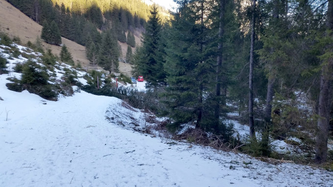 dann könnte bis zweite Kurve P. 1318 gefahren und geparkt (zweiter Baumstamm auf 1340m, könnte mit 6 Leuten weggezogen werden >> jedoch ab da Schnee zu Fellen, dann nur im Erbs Chirel kurzes Tragstück...